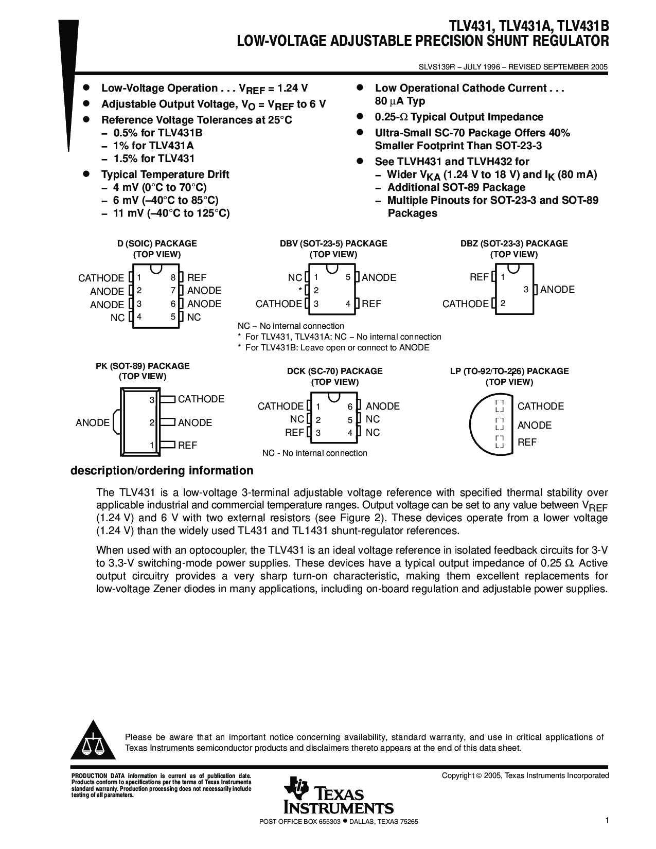 * 用于 tlv431, tlv431a: nc − 否 内部 连接