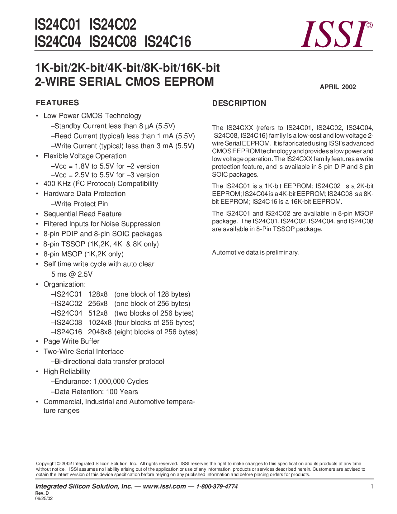 浏览型号IS24C02-2PI的Datasheet PDF文件第2页