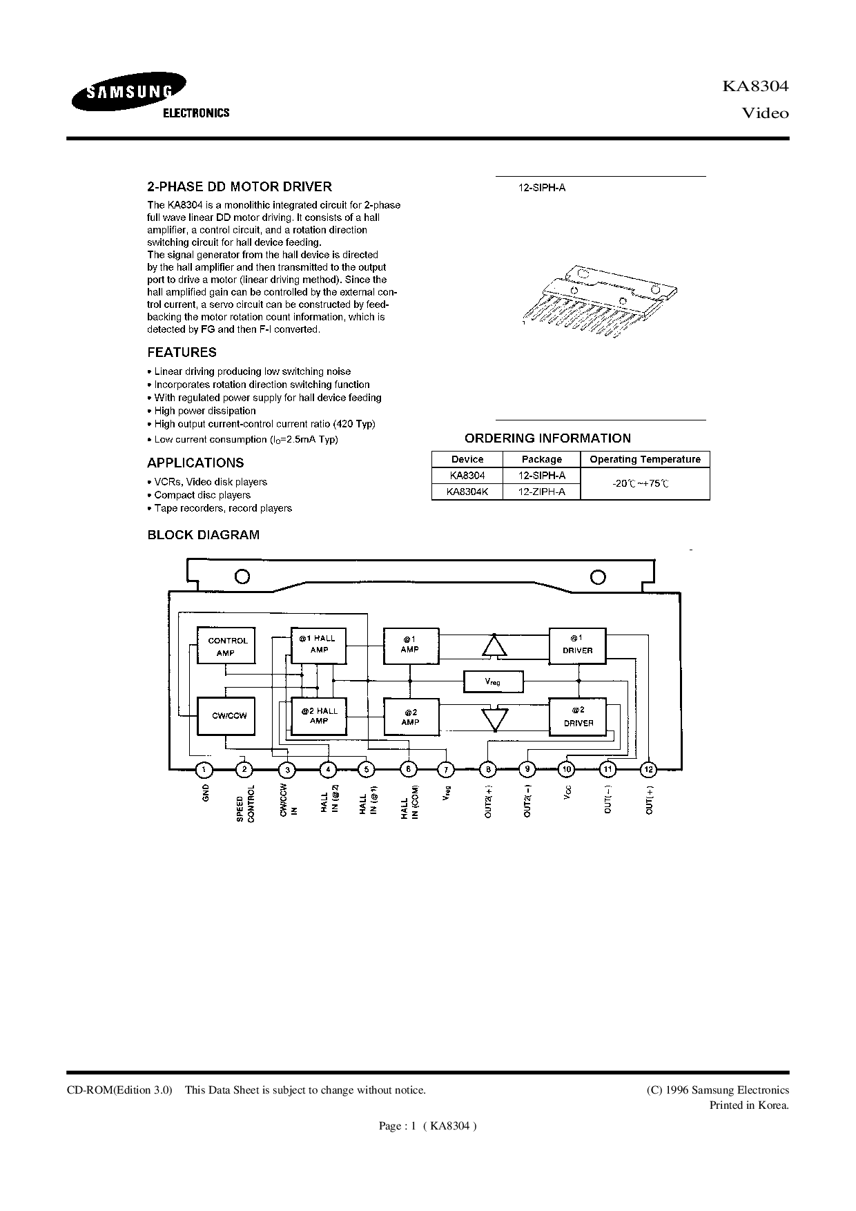 KA8304 视频 光盘-rom(版本 3.0) 这个 数据 工作表 是 主题 至 变更 无 通知. (c) 1996 samsung 电子产品 已打印 入点 韩国. 第页 : 1 ( ka8304 ) | |