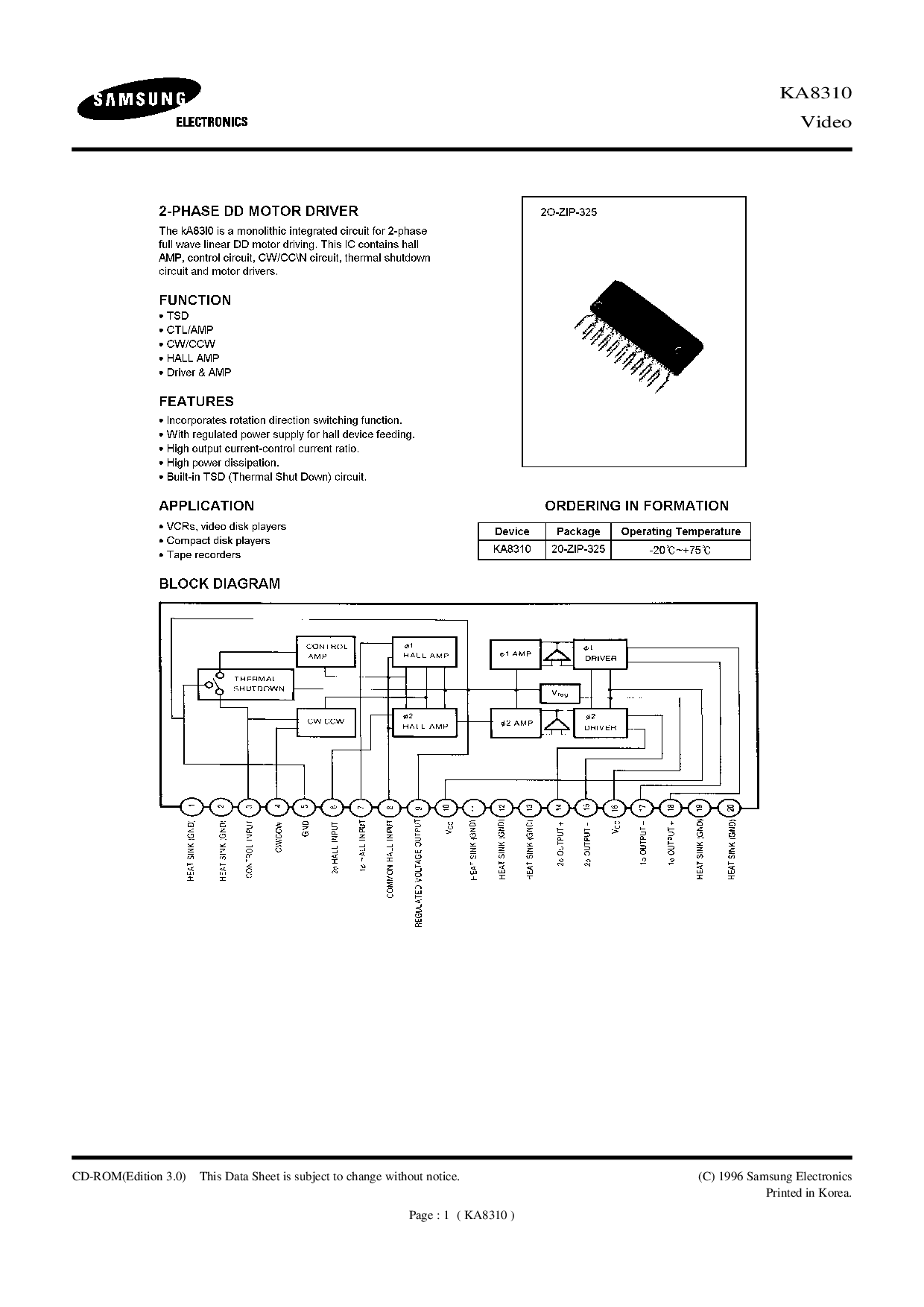 KA8310 视频 光盘-rom(版本 3.0) 这个 数据 工作表 是 主题 至 变更 无 通知. (c) 1996 samsung 电子产品 已打印 入点 韩国. 第页 : 1 ( ka8310 ) | |