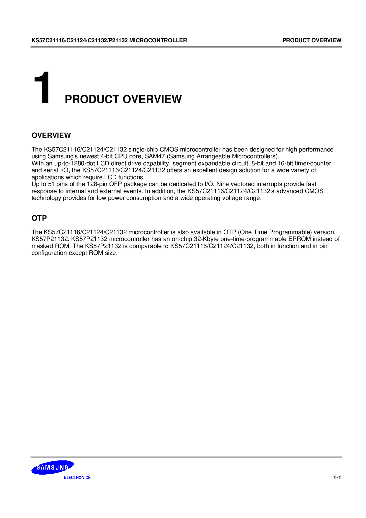 The KS57C21116/C21124/C21132 single-chip CMOS microcontroller has been designed for high performance using Samsungs newest 4-bit CPU core, SAM47 (Sams