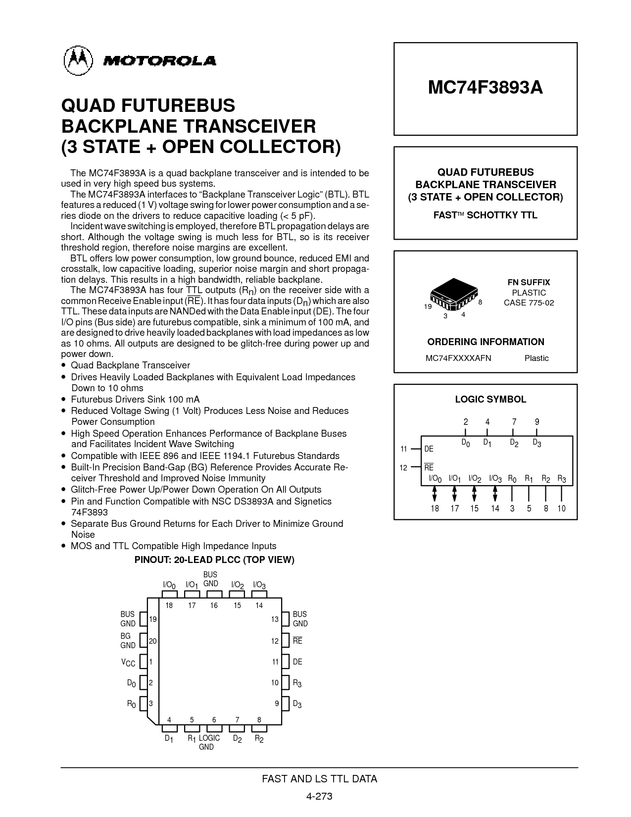 mc74f3893a 是 一个 四边形 背板 收发器 和 是 预期 至 是