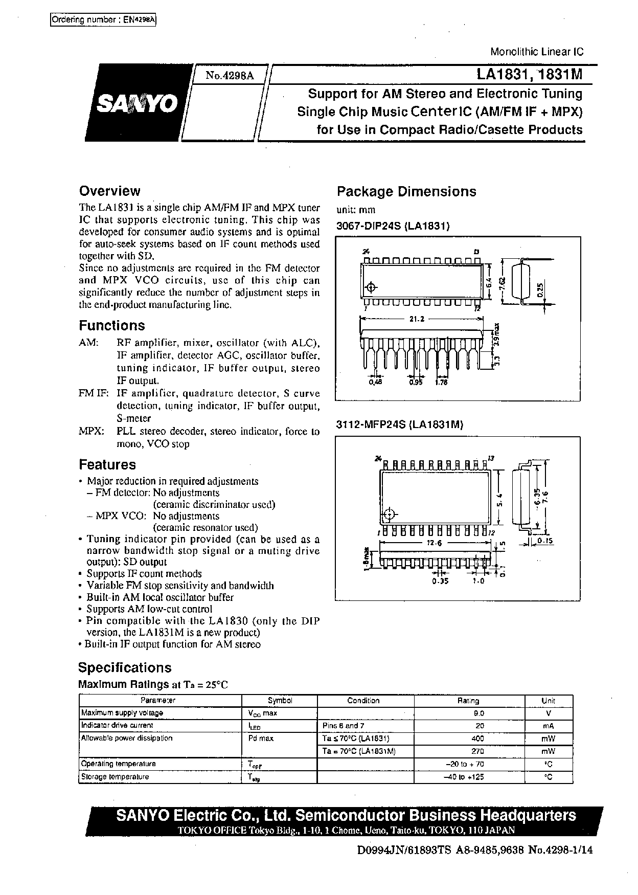 Support for AM Stereo and Electronic Tuning Single Chip Music Center IC (AM/FM IF + MPX) for Use in Compact Radio/Casette Products