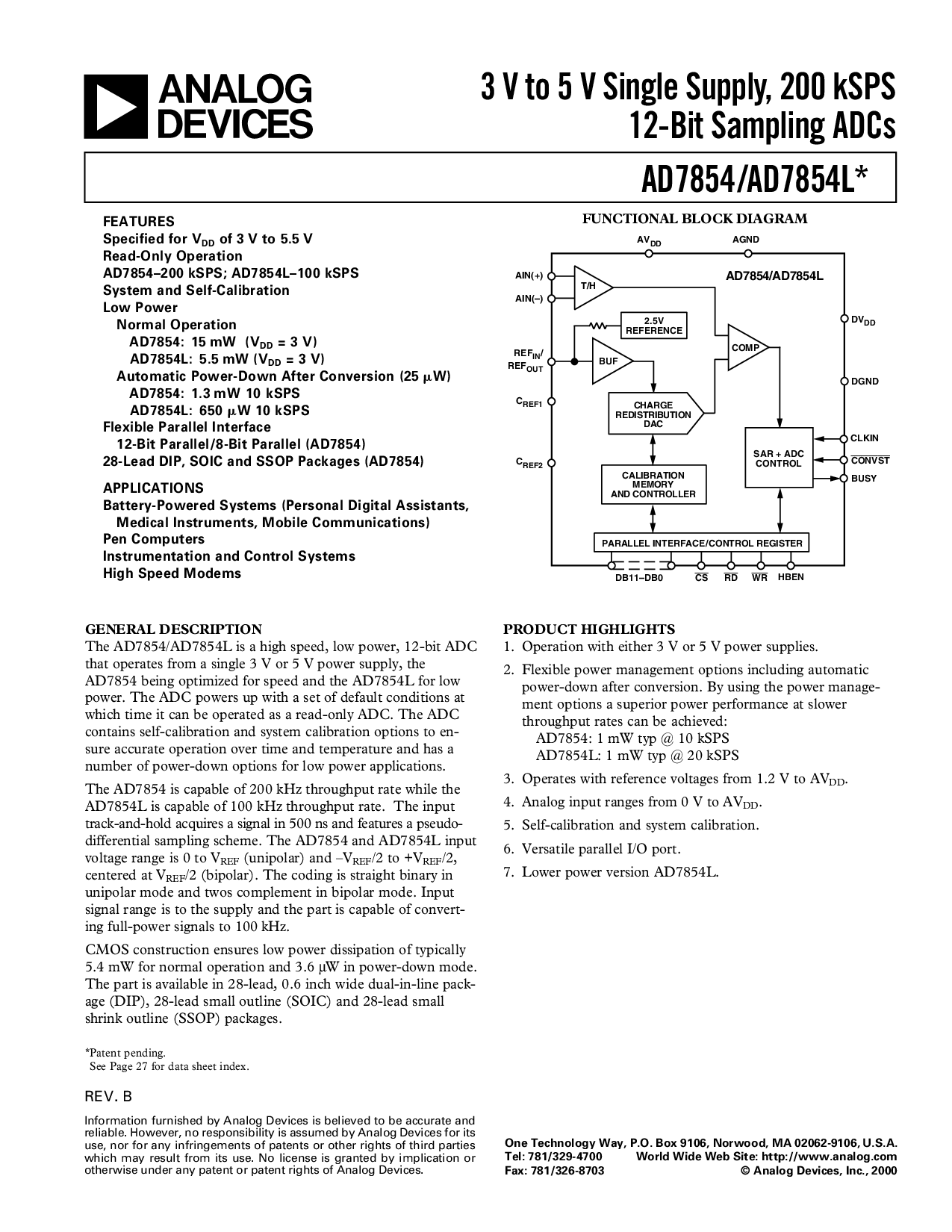 这 ad7854/ad7854l 是 一个 高 速度, 低 电源, 12-有点 adc