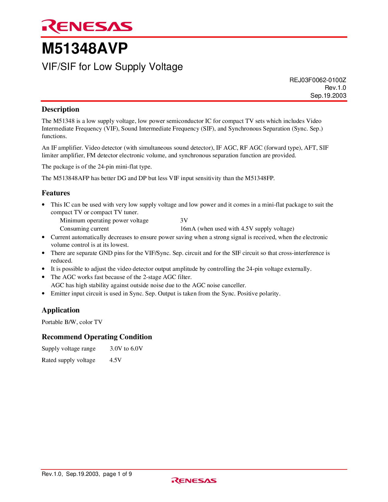 这 m51348 是 一个 低 供应 电压, 低 电源 半导体 集成电路 用于 紧凑型 tv 集 哪个 包括 视频