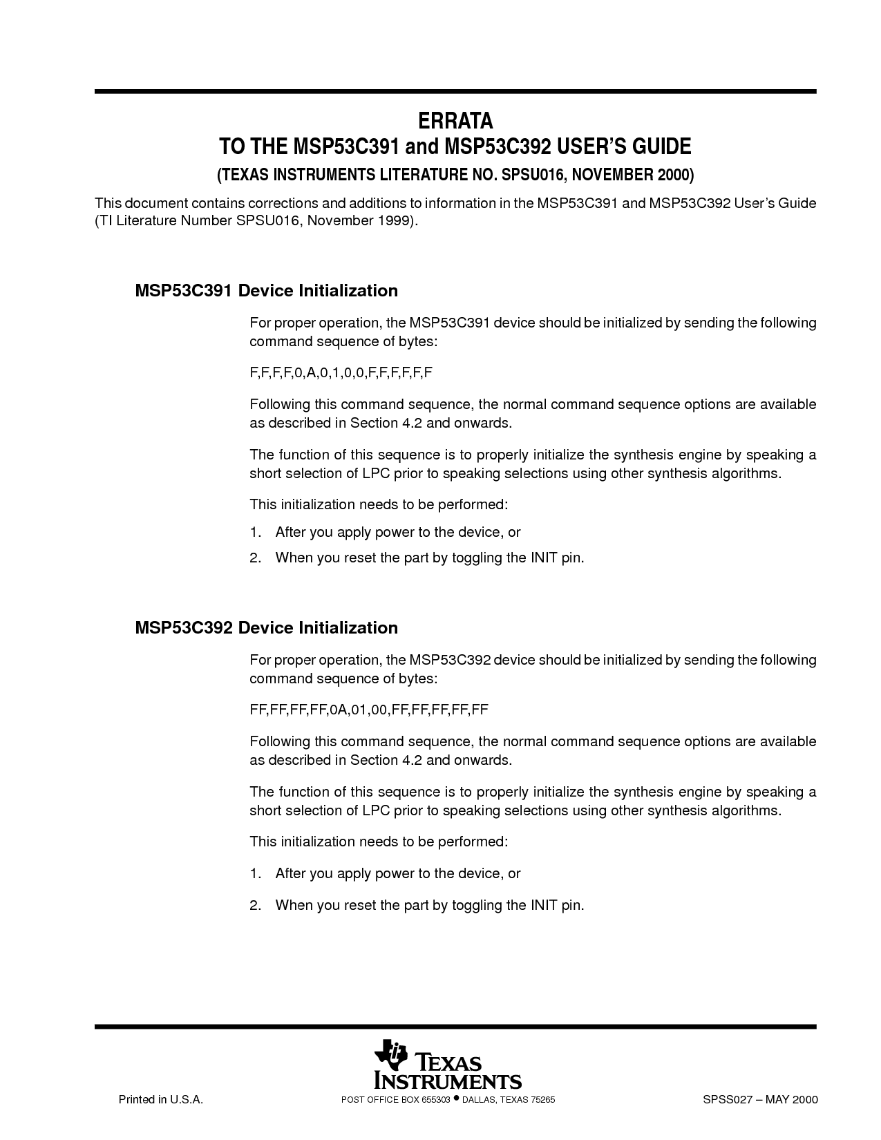 用于 适当的 操作, 这 msp53c392 设备 应该 是 已初始化 由 正在发送 这 以下内容