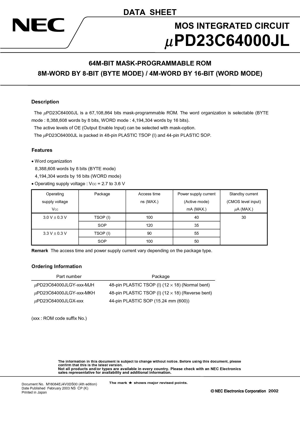 pd23c64000jl 是 一个 67,108,864 比特 掩模可编程 rom. 这 字 组织机构 是 可选择 (字节