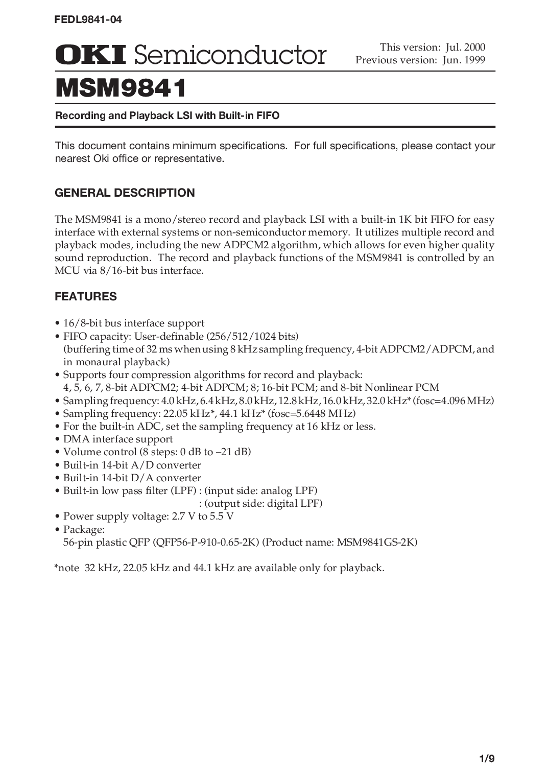 这 msm9841 是 一个 单声道/立体声 记录 和 回放 lsi 与 一个 内置 1k 有点 先进先出 用于 容易