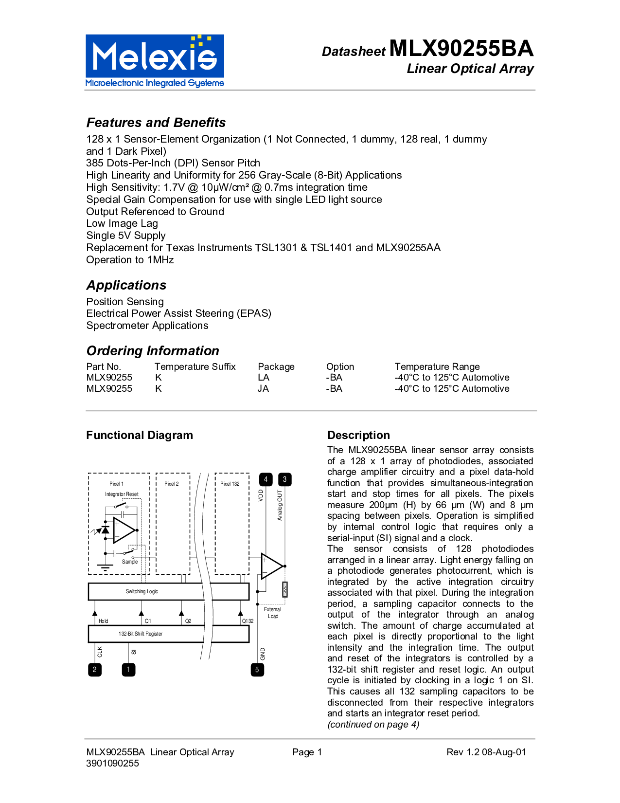 mlx90255ba 线性 光学 阵列 第页 1 rev 1.2 08-8月-01