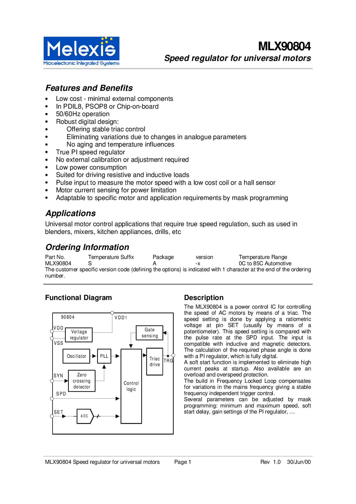 mlx90804 速度 reg调节器 用于 通用 电机 pa通用电气 1 rev 1.0 30/六月/00
