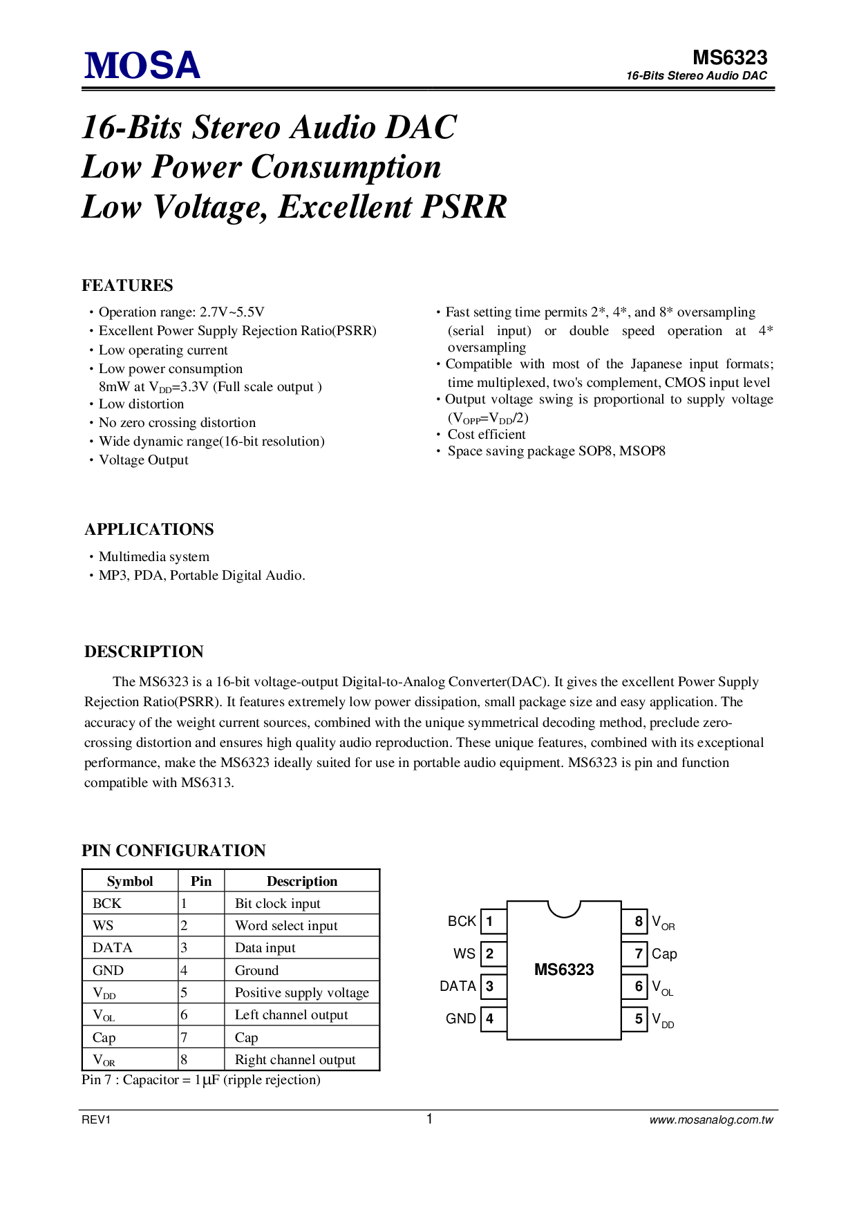 业绩, 制造 这 ms6323 理想情况下 适合 用于 使用 入点便携式 音频 设备. ms6323 是 管脚 和 功能