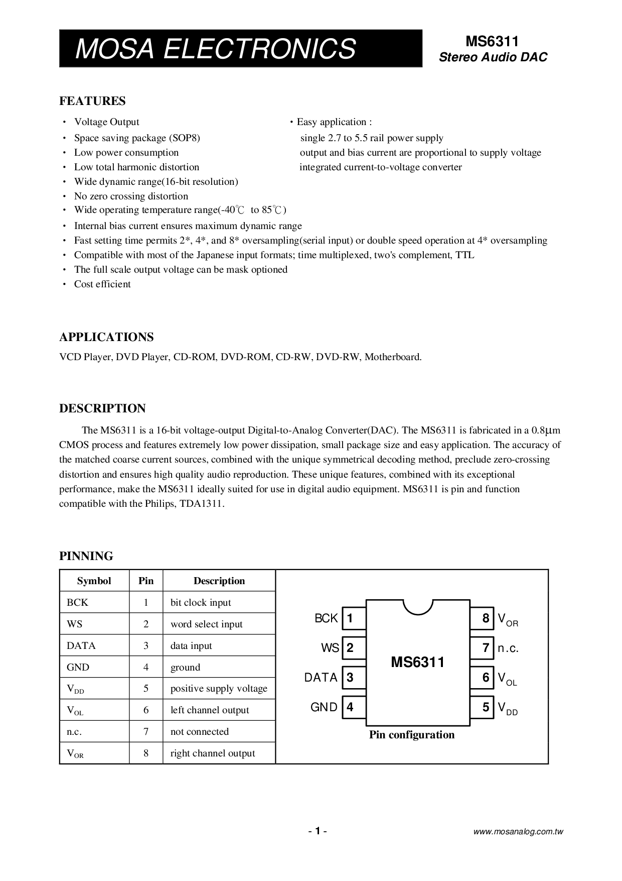 业绩, 制造 这 ms6311 理想情况下 适合 用于 使用 入点数字 音频 设备. ms6311 是 管脚 和 功能