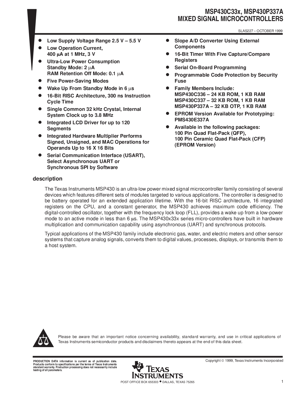 这 德州 仪器仪表 msp430 是 一个 超-低 电源 混合 信号 微控制器 家庭 由 的 几个