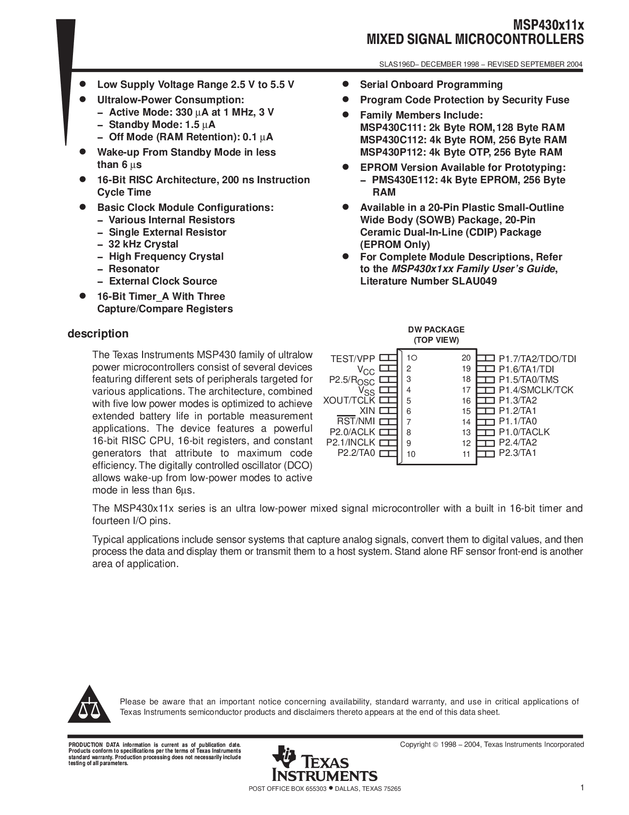 msp430c112: 4k 字节 rom, 256 字节 ram