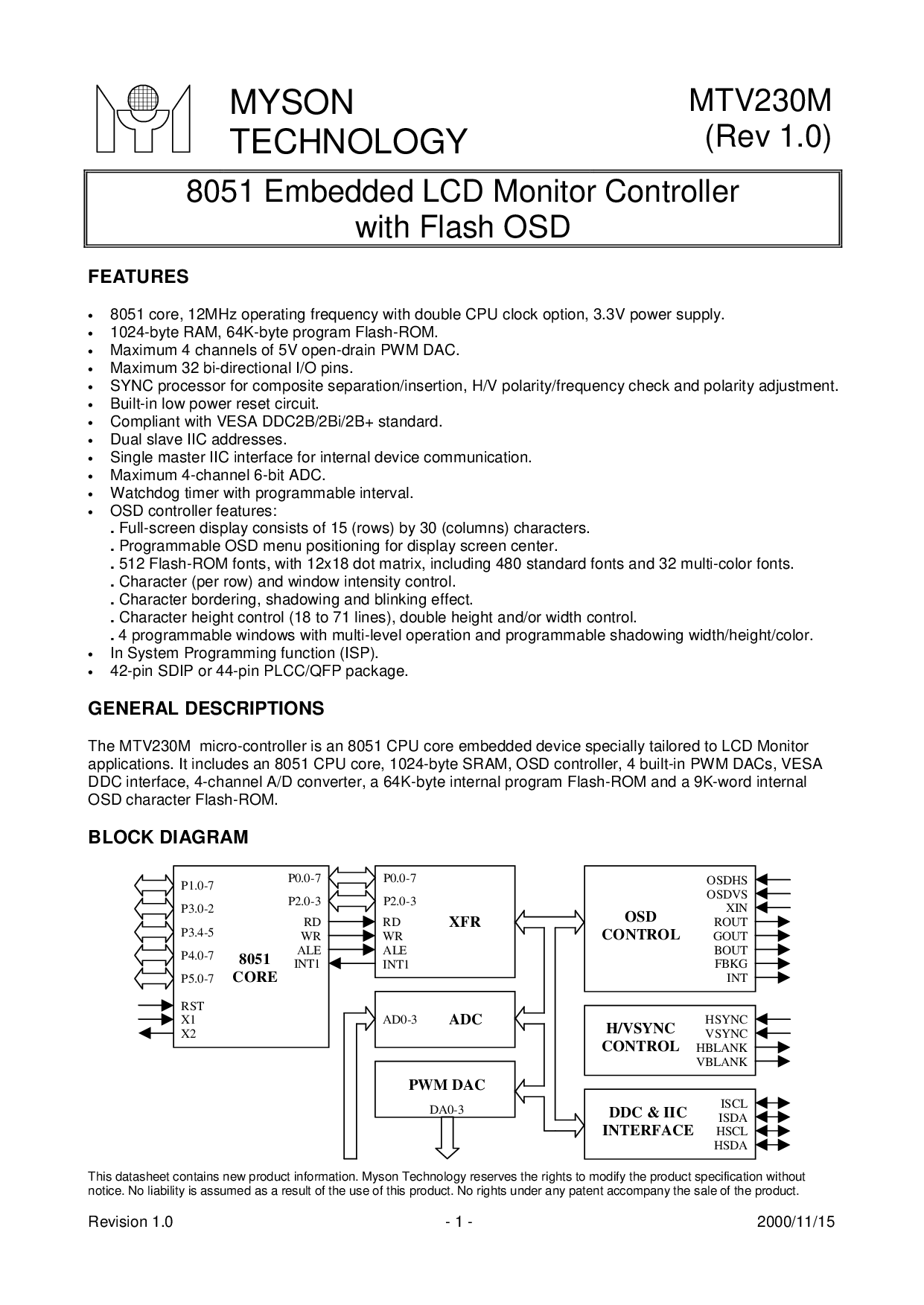 应用程序. 它 包括 一个 8051 cpu 核心, 1024-字节 sram, osd controller, 4 内置 pwm dacs, vesa