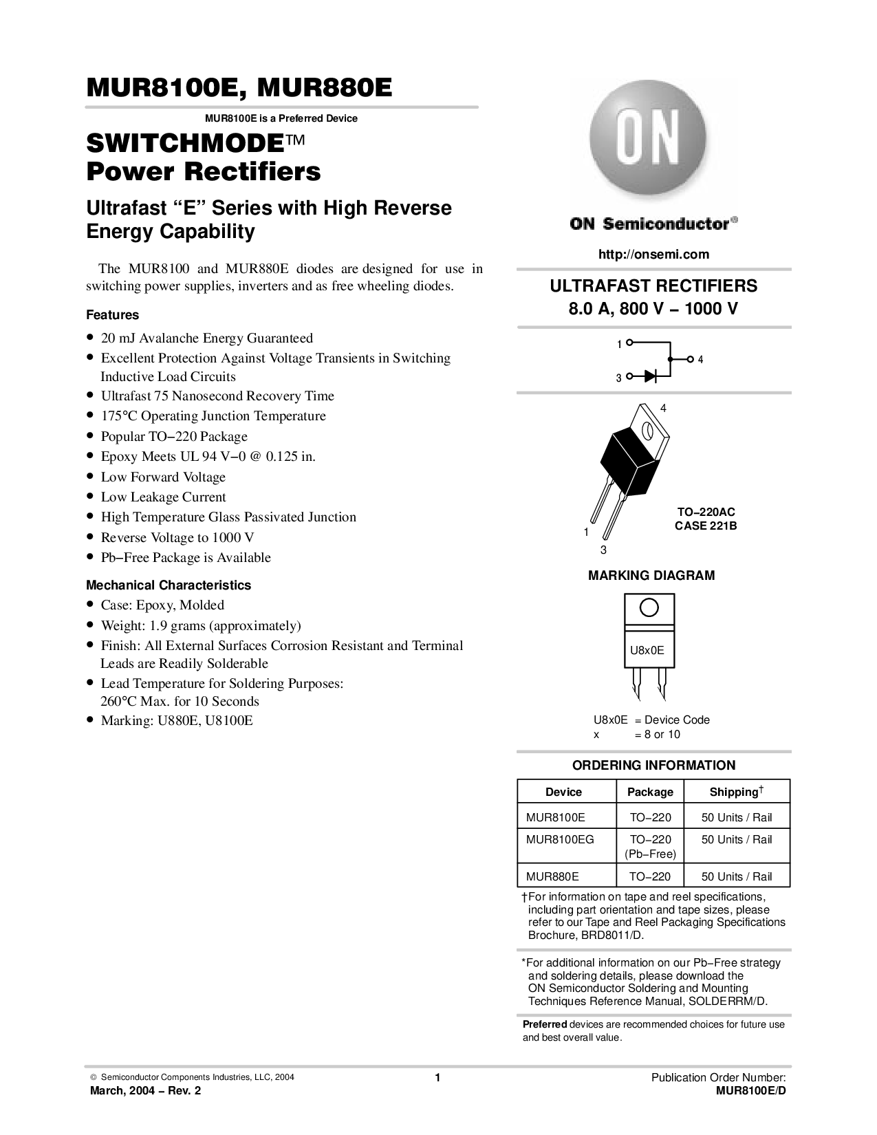 MUR880E TO−220 50 单位 / 轨道