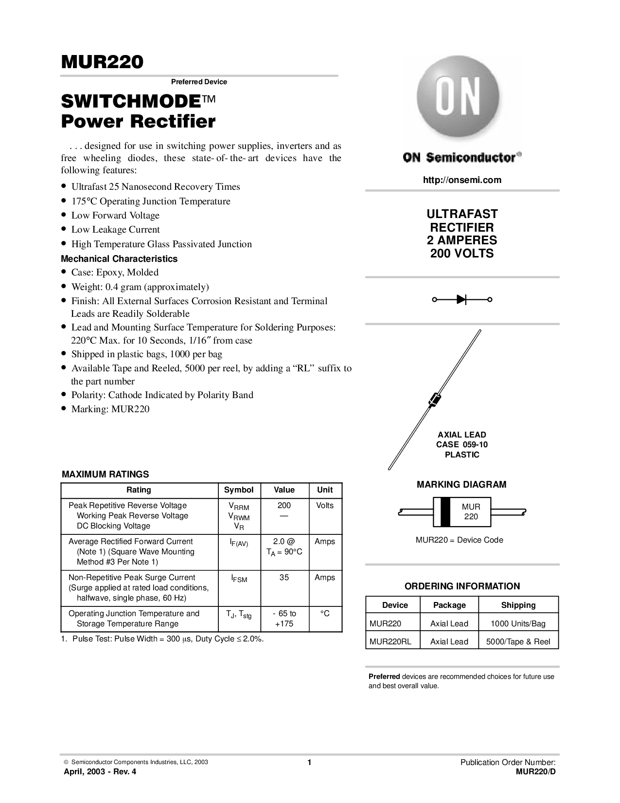 MUR220RL 轴向 铅 5000/胶带 &放大器; 卷轴