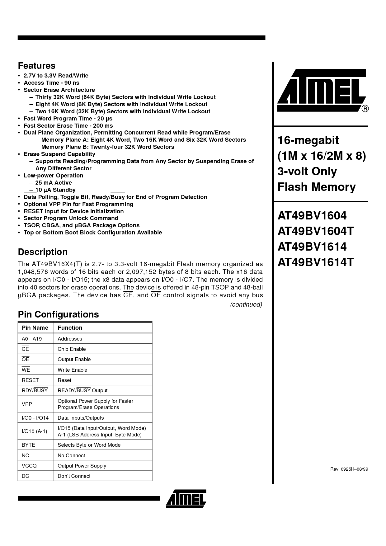 16-Megabit 1M x 16/2M x 8 3-volt Only Flash Memory