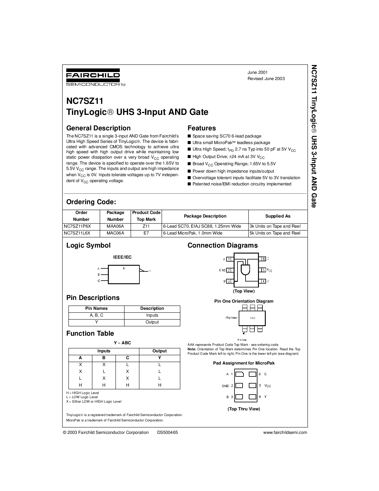 NC7SZ11L6X MAC06A E7 6-铅 micropak, 1.0mm 宽 5k 单位 开启 胶带 和 卷轴