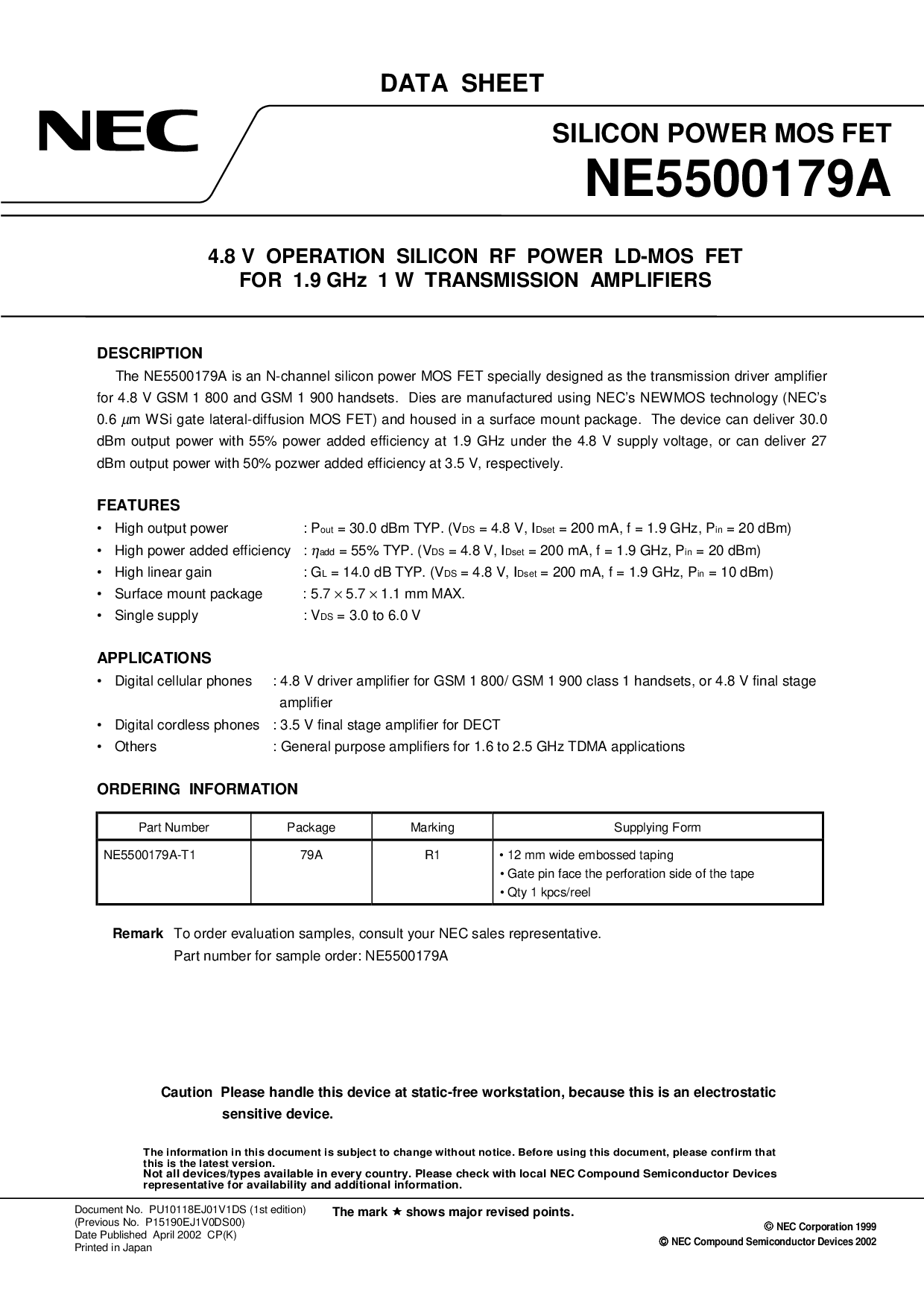 这 ne5500179a 是 一个 n通道 硅 电源 mos 场效应晶体管 特别 设计 作为 这 变速器 驾驶员 放大器