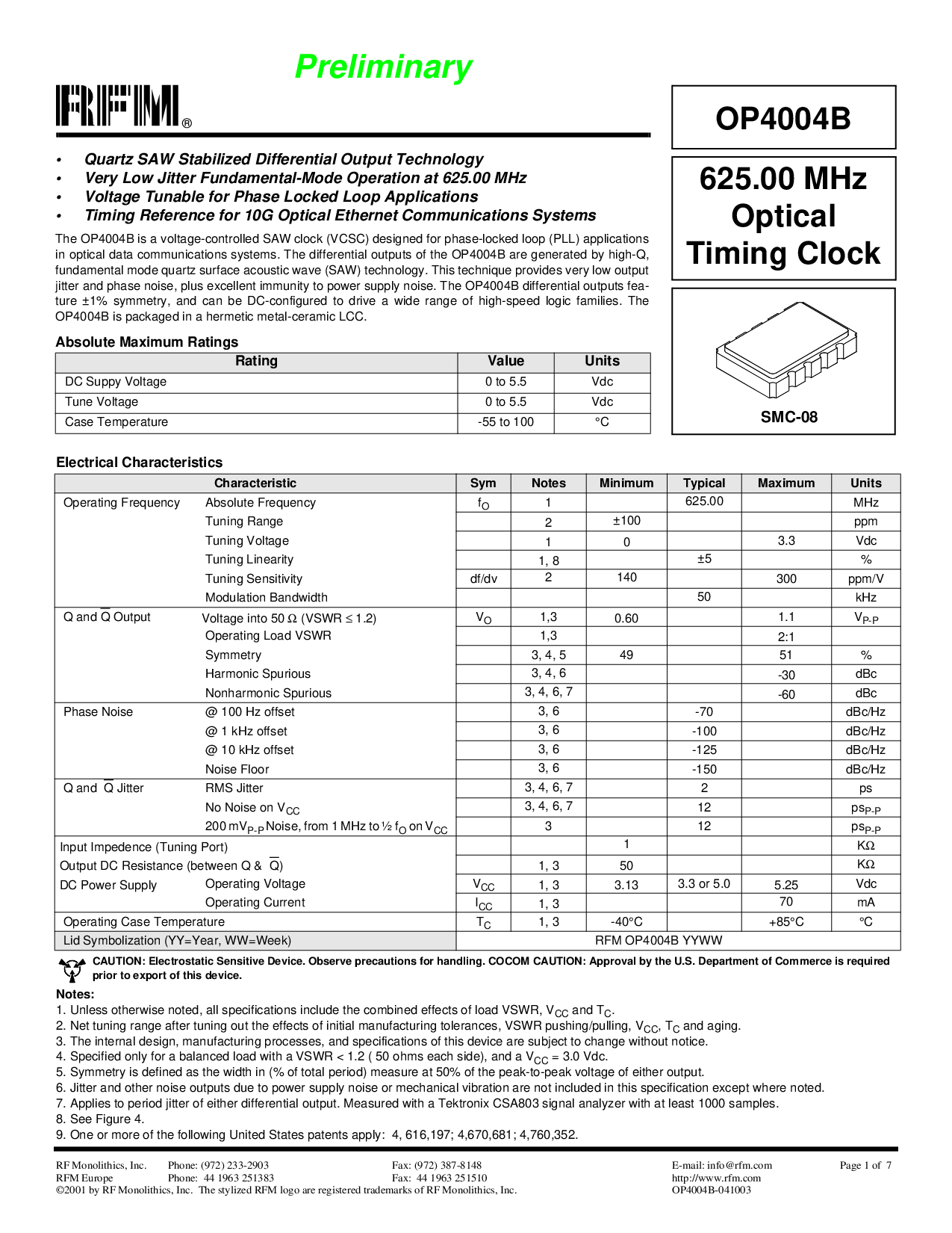 ©2001 由 rf monolithics, 公司 这 stylized rfm 徽标 是 已注册 商标 的 rf monolithics, 公司 op4004b-041003