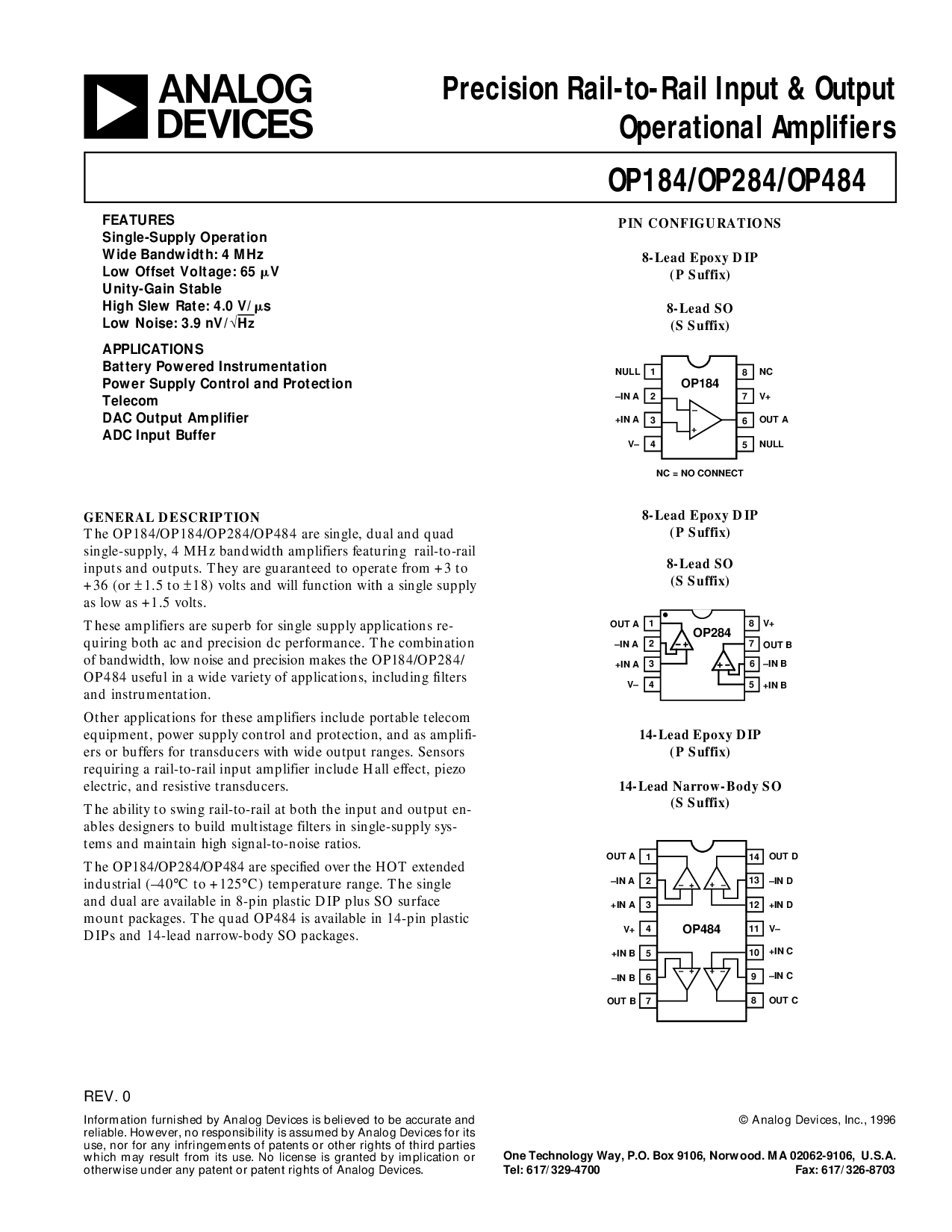 的 带宽, 低 噪声 和 精度 使 这 op184/op284/