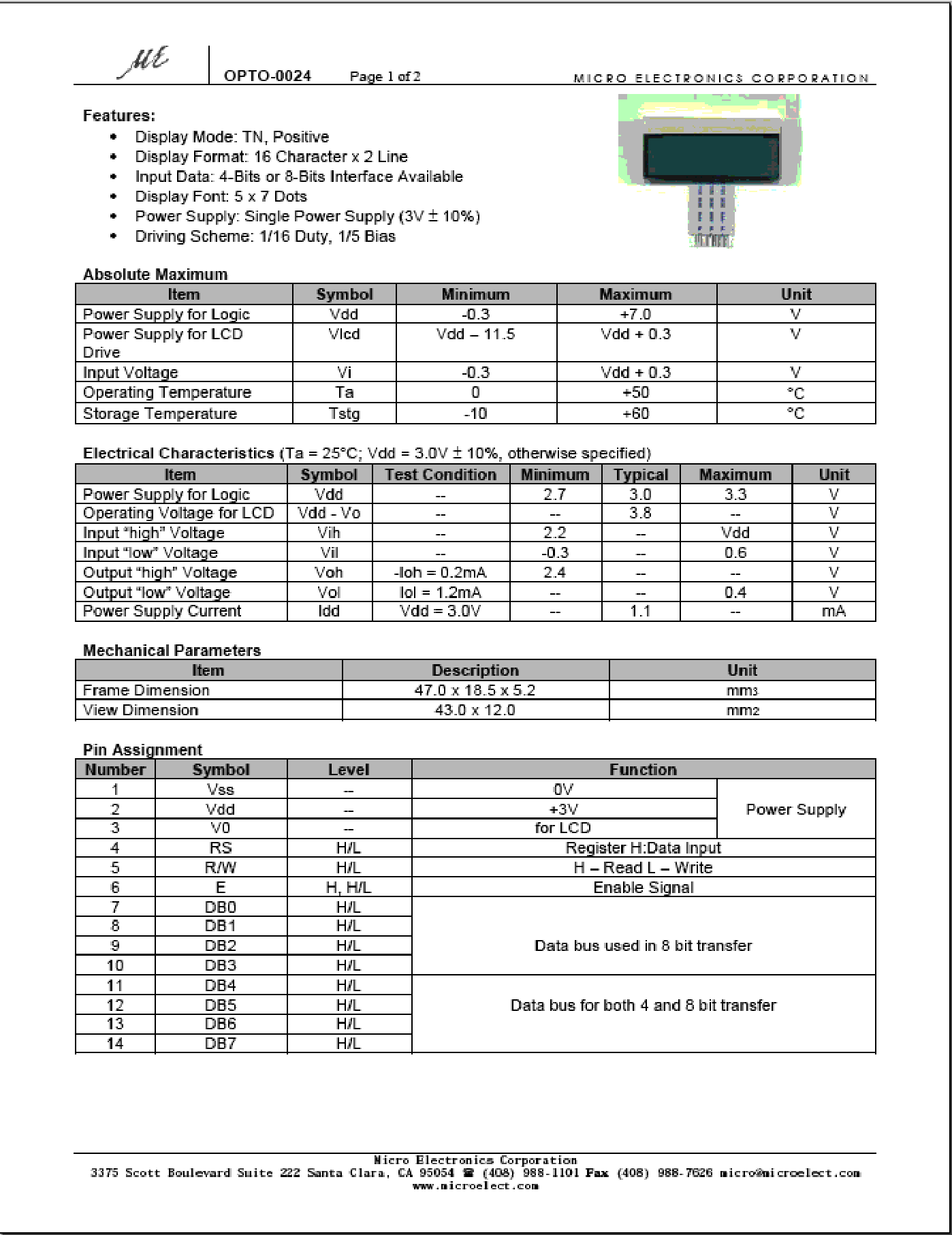 DISPLAY MODE: TN, POSITIVE , DISPLAY FORMAT: 16 CHARACTER X 2 LINE