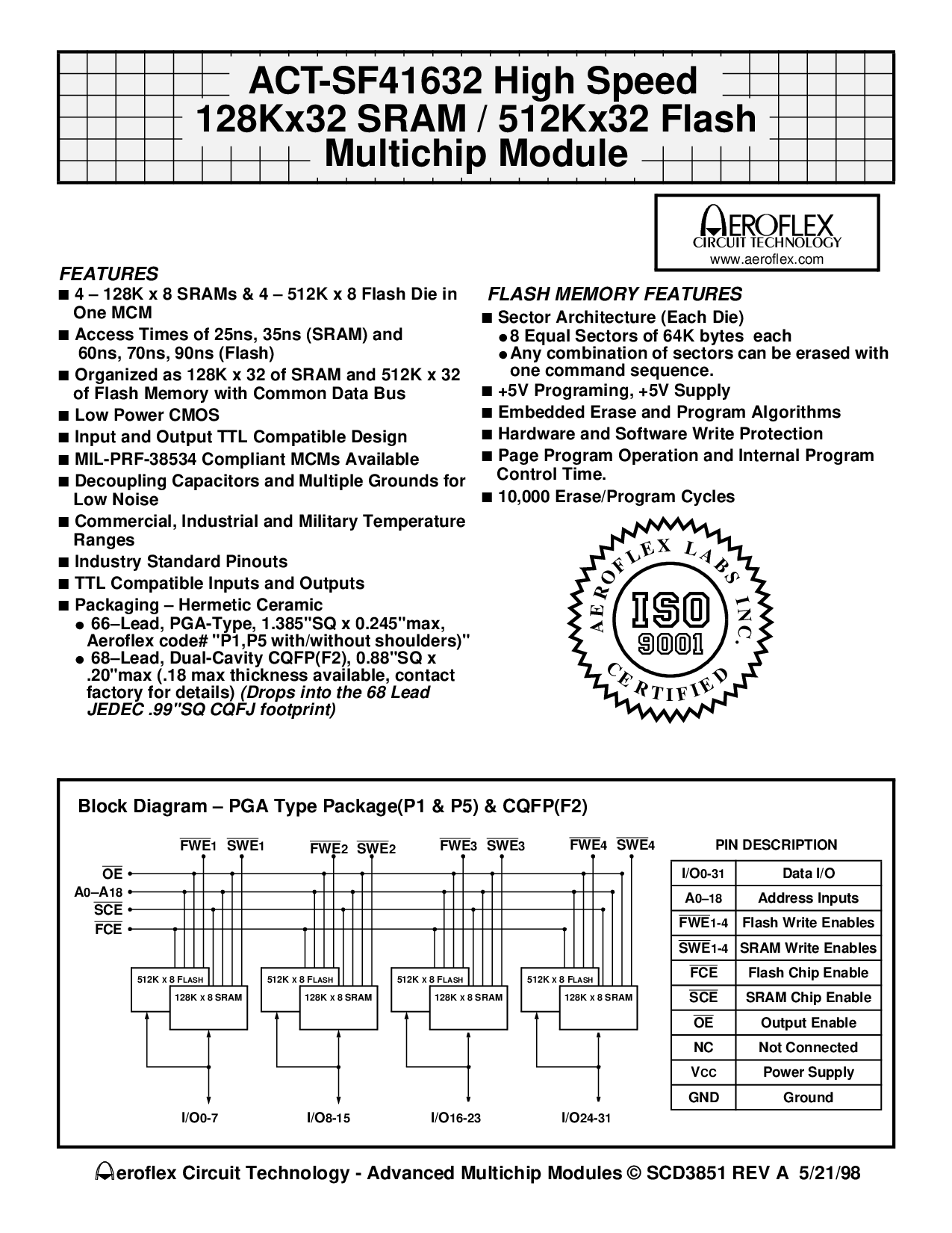 ACT-SF41632 High Speed 128Kx32 SRAM / 512Kx32 Flash Multichip Module