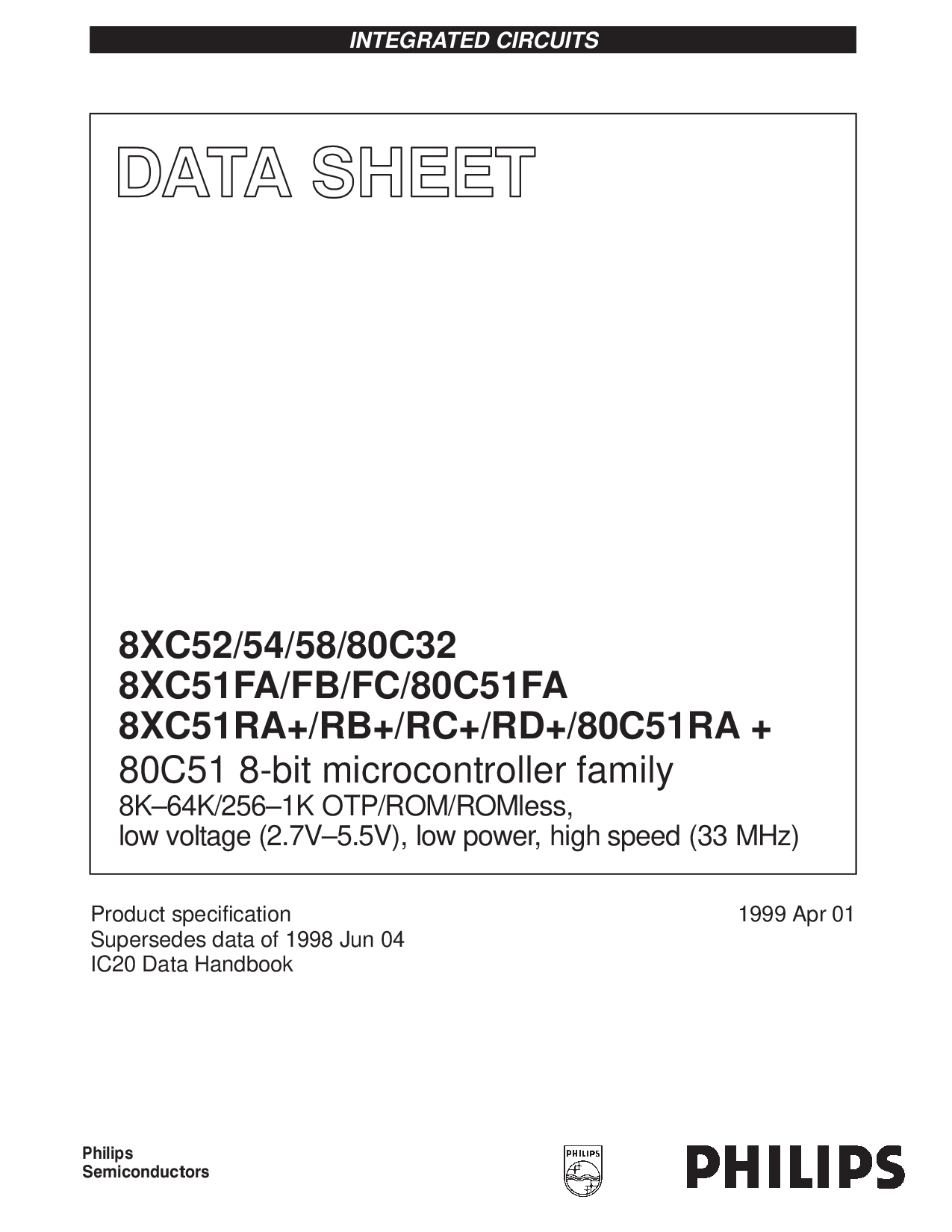 80C51 8-bit microcontroller family 8K.64K/256.1K OTP/ROM/ROMless, low voltage 2.7V.5.5V, low power, high speed 33 MHz