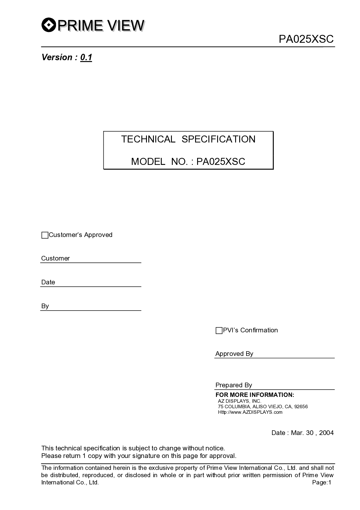 This technical specification applies to 2.5inch color TFT-LCD panel.