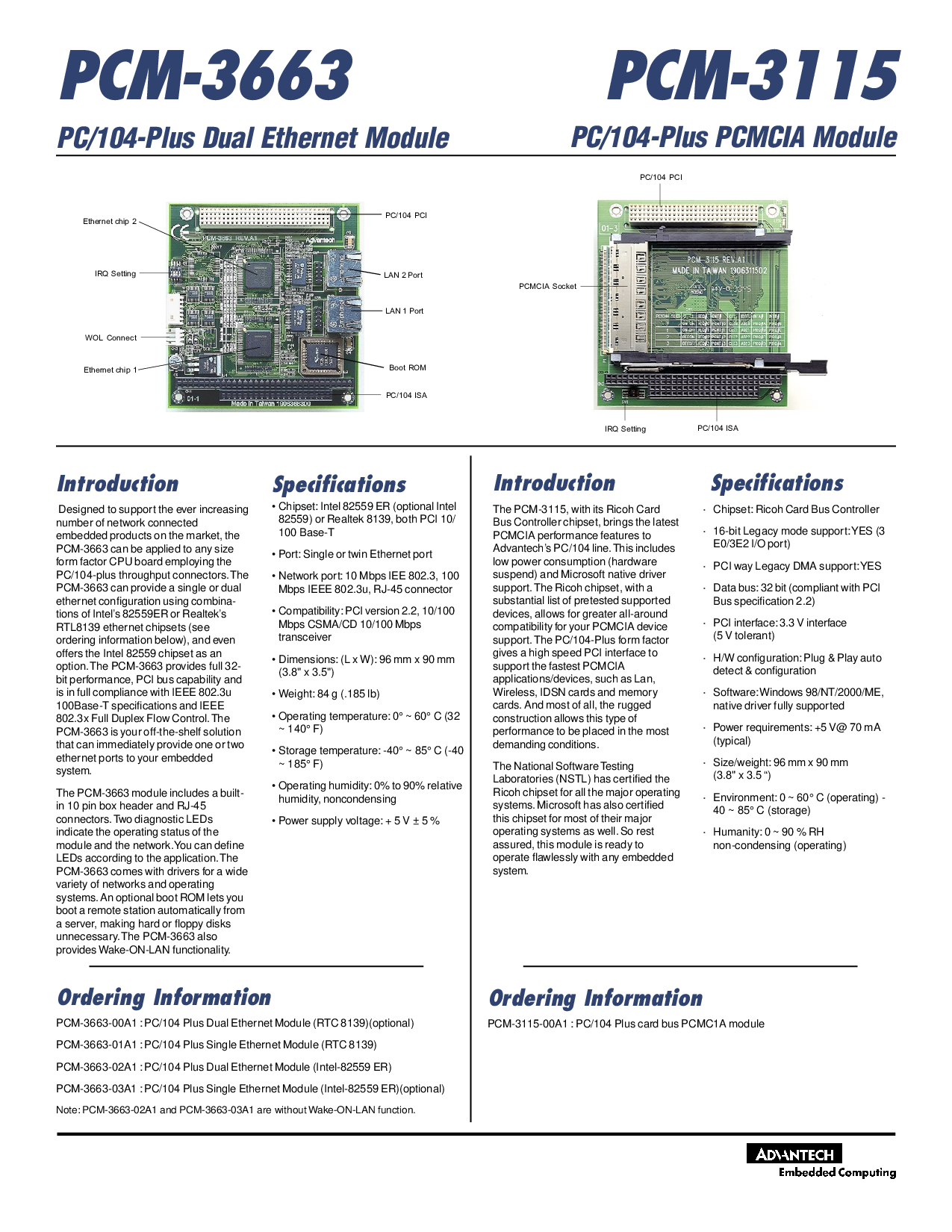 pcm-3663-00a1 : pc/104 加号 双 以太网 模块 (rtc 8139)(optional)
