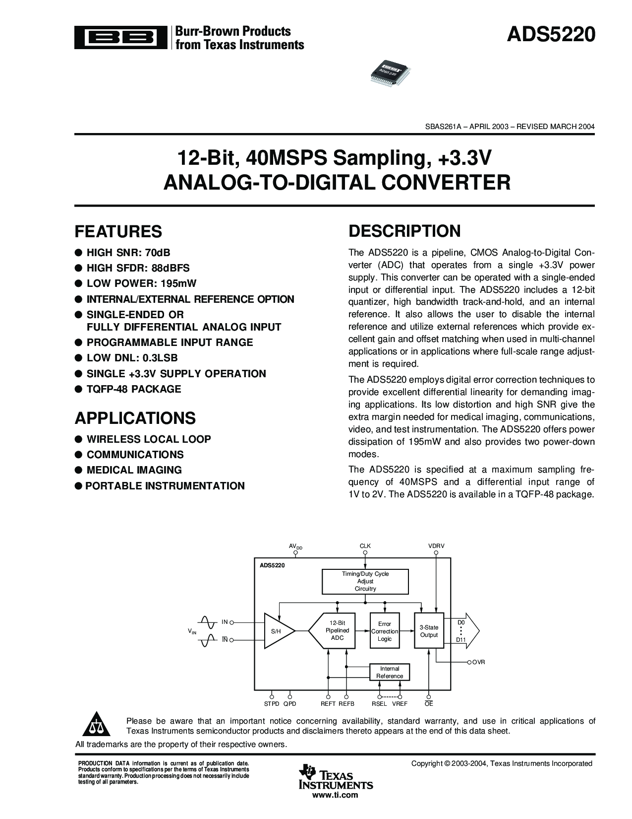 1v 至 2v. 这 ads5220 是 可用 入点 一个 tqfp-48 包装.