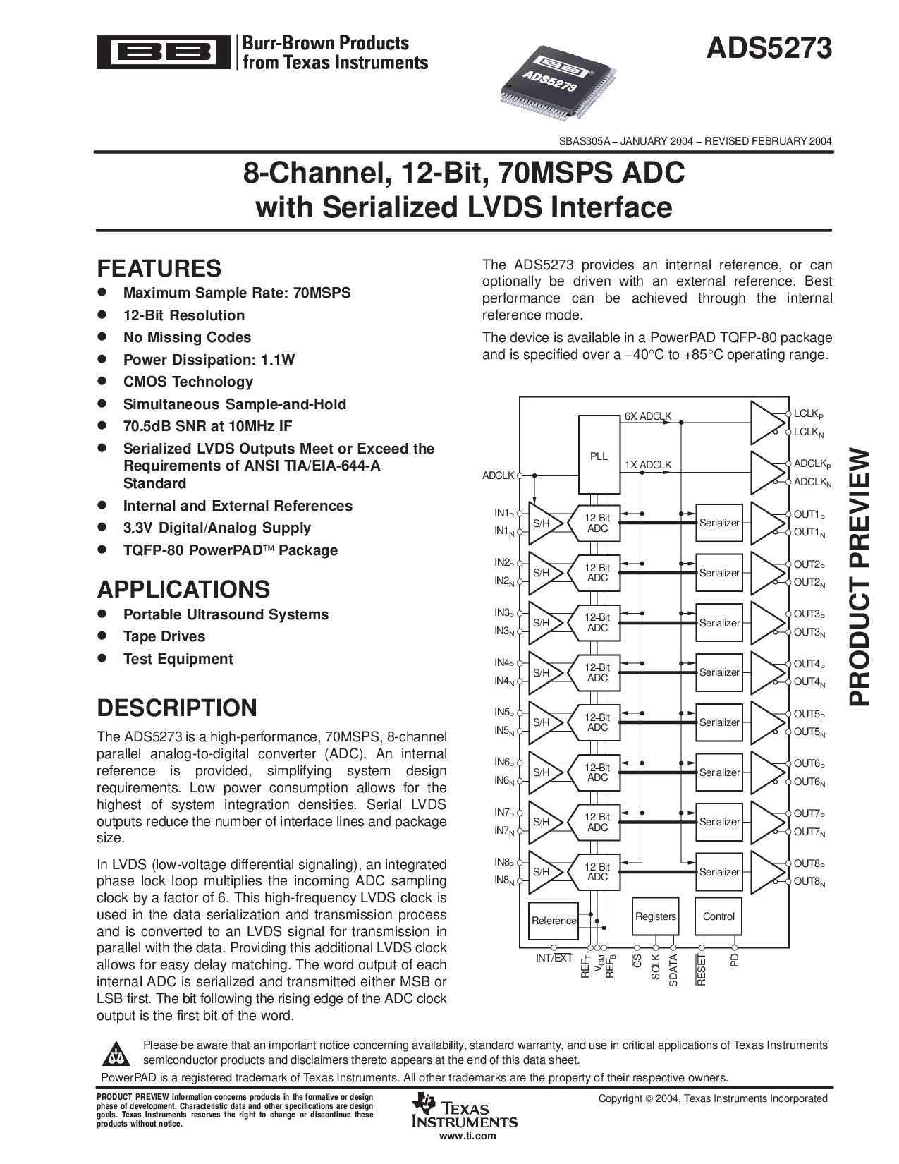 这 ads5273 是 一个高-业绩, 70msps, 8-频道