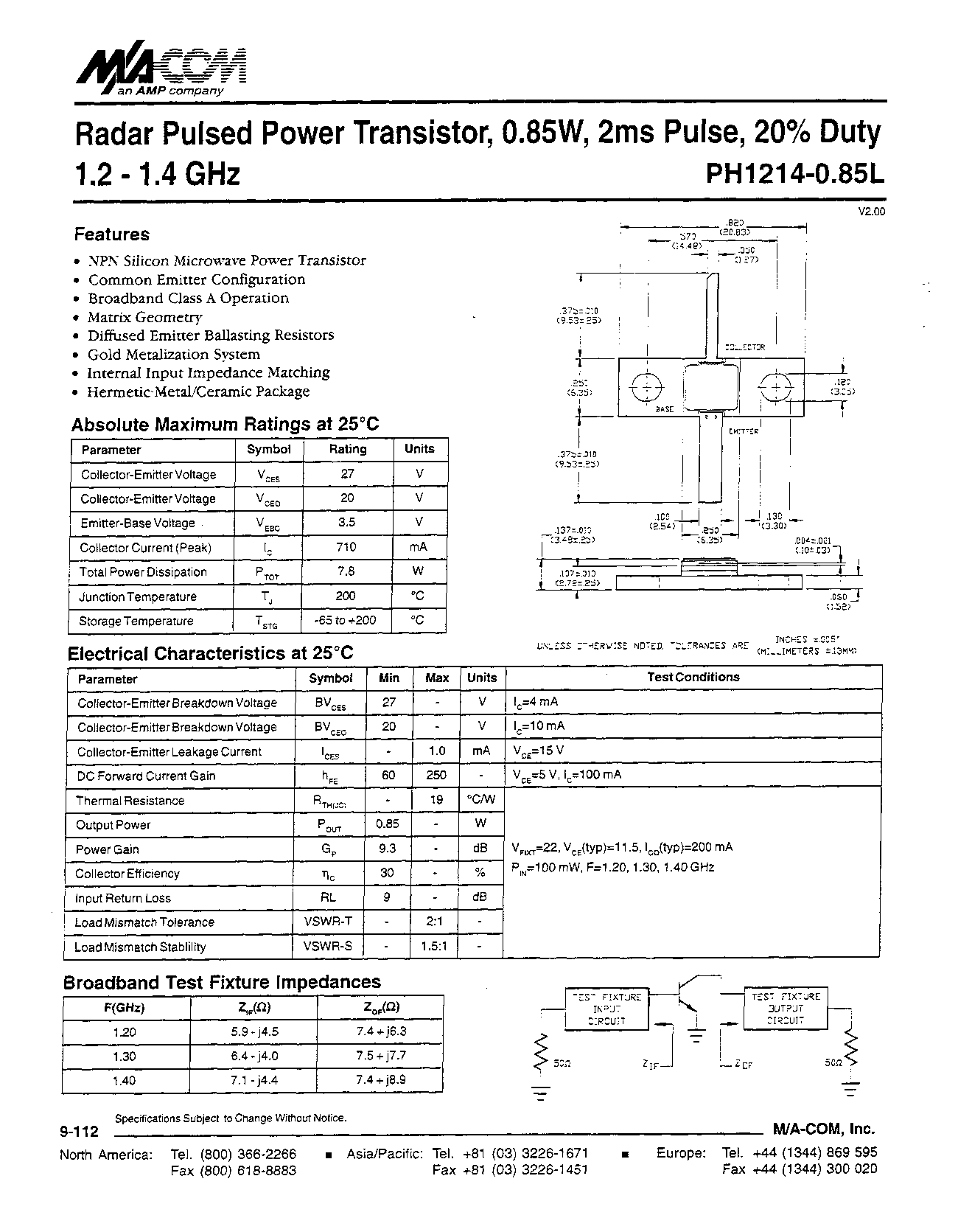 Radar Pulsed Power Transistor, 0.85W, 2ms Pulse, 20% Duty 1.2 - 1.4 GHz
