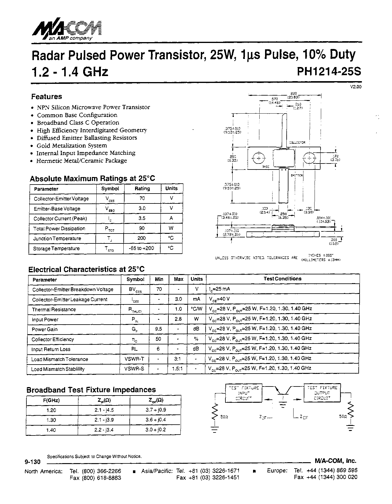 Radar Pulsed Power Transistor, 25W, lms Pulse, 10% Duty 1.2 - 1.4 GHz