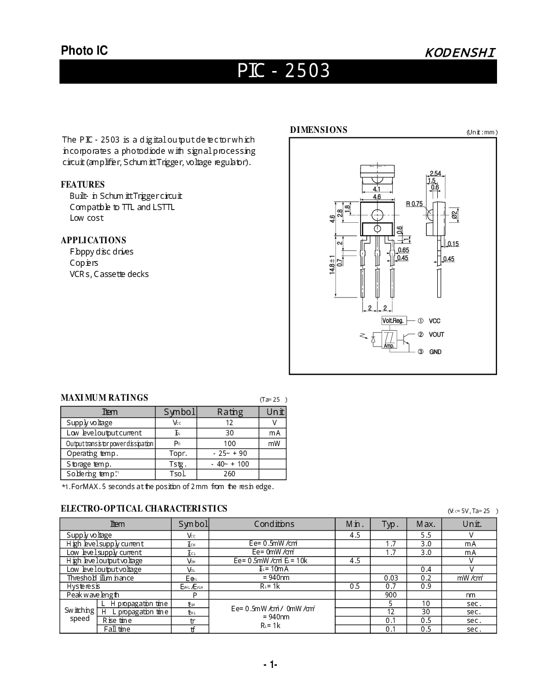 - 1- 照片 集成电路 f e? 一个 t u 右 e? s 一个 p p l 我 c 一个 t 我 o n s d 我 m e? n s 我 o n s 最大值 额定值 电-光学 特性 | |