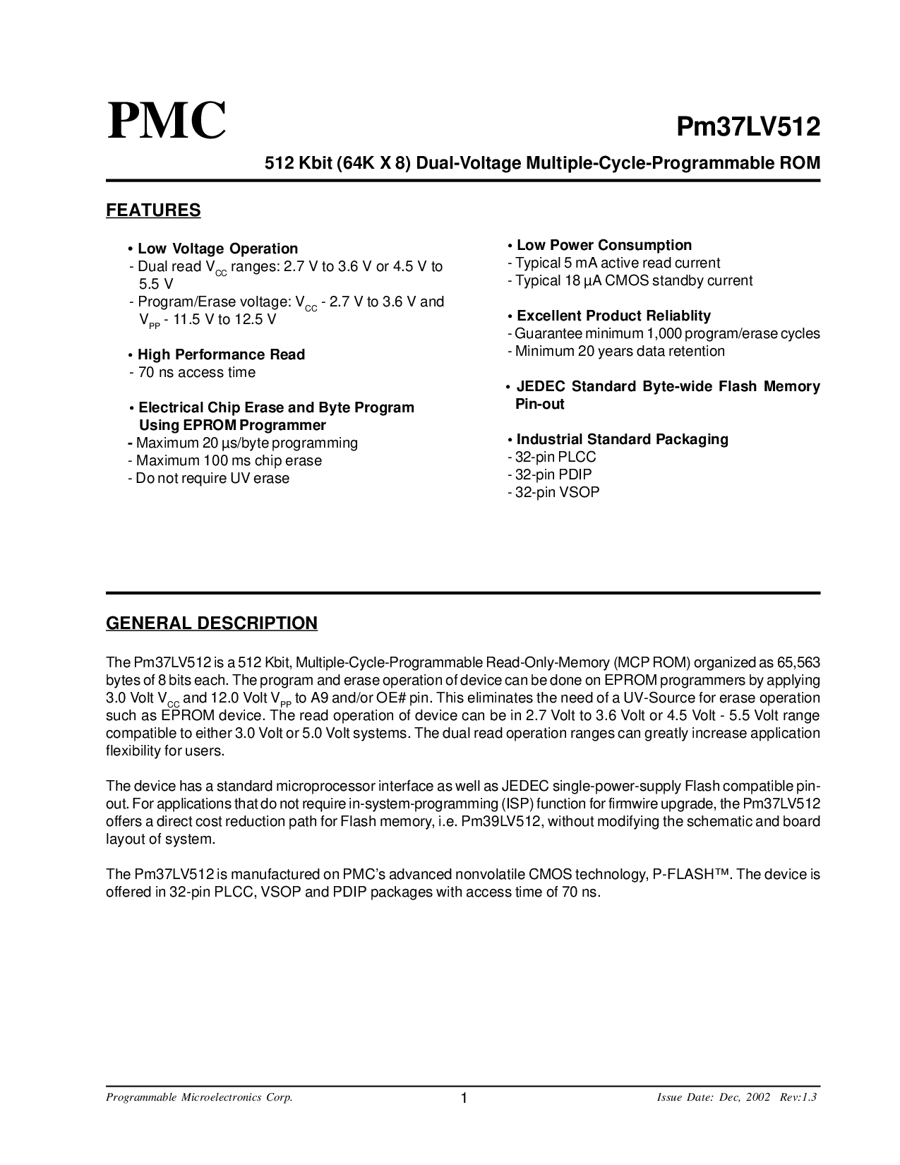 这 pm37lv512 是 已制造 开启 pmc’s 高级 非挥发性 cmos 技术, p-flash™. 这 设备 是