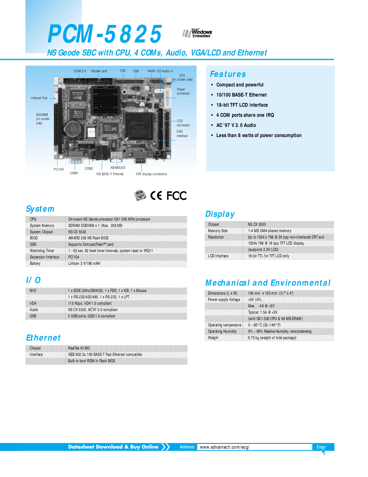 NS Geode SBC with CPU, 4 COMs, Audio, VGA/LCD and Ethernet