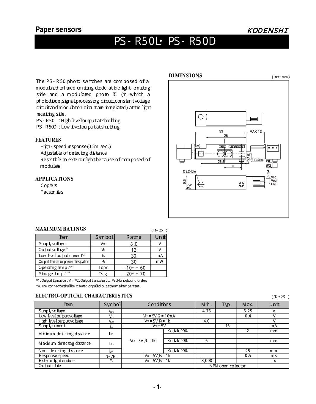 - 1- 纸张 传感器 f e? 一个 t u 右 e? s 一个 p p l 我 c 一个 t 我 o n s d 我 m e? n s 我 o n s 最大值 额定值 电-光学 特性 | |