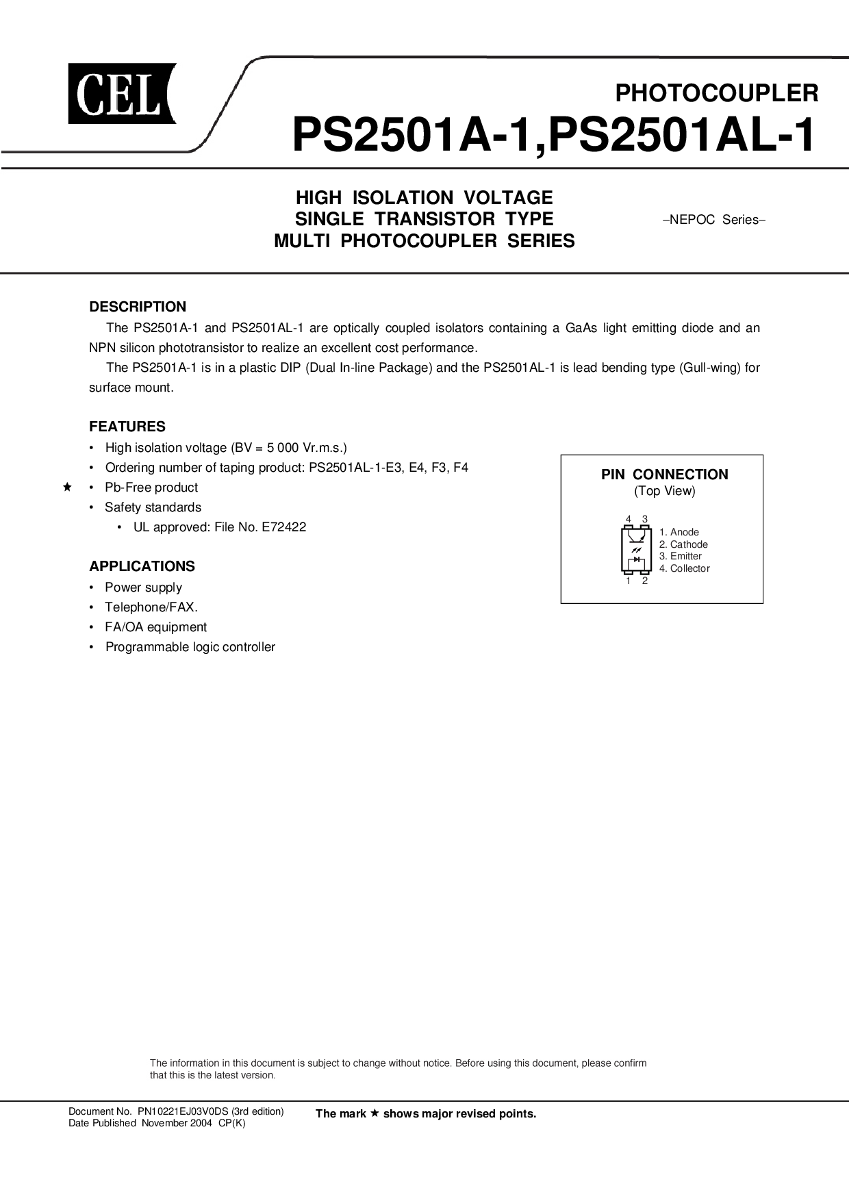 这 ps2501a-1 和 ps2501al-1 是 光学 耦合 isolators 包含 一个 gaas 灯光 发射 二极管 和 一个