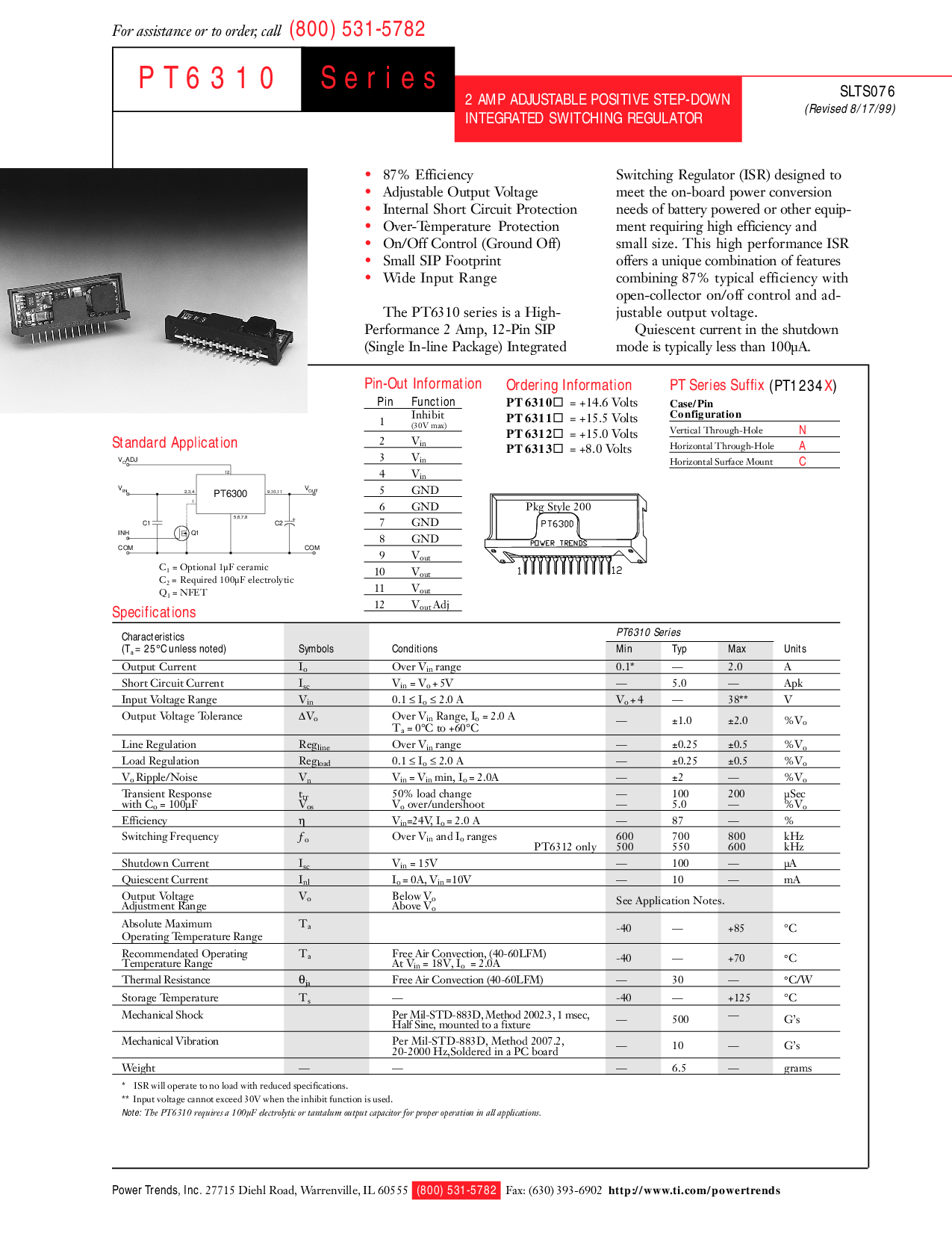 这 pt6310 需要 一个 100µf 电解 或 钽 输出 电容器 用于 适当的 操作 入点 全部 应用程序.