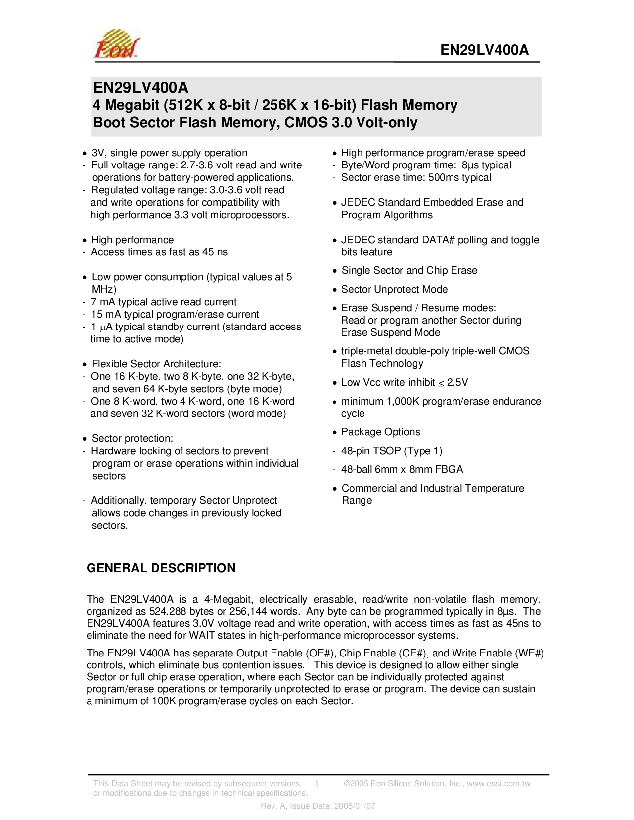 en29lv400a 特点 3.0v 电压 右ead 和 写 操作, 与 访问权限 次 作为 快 作为 45ns 至