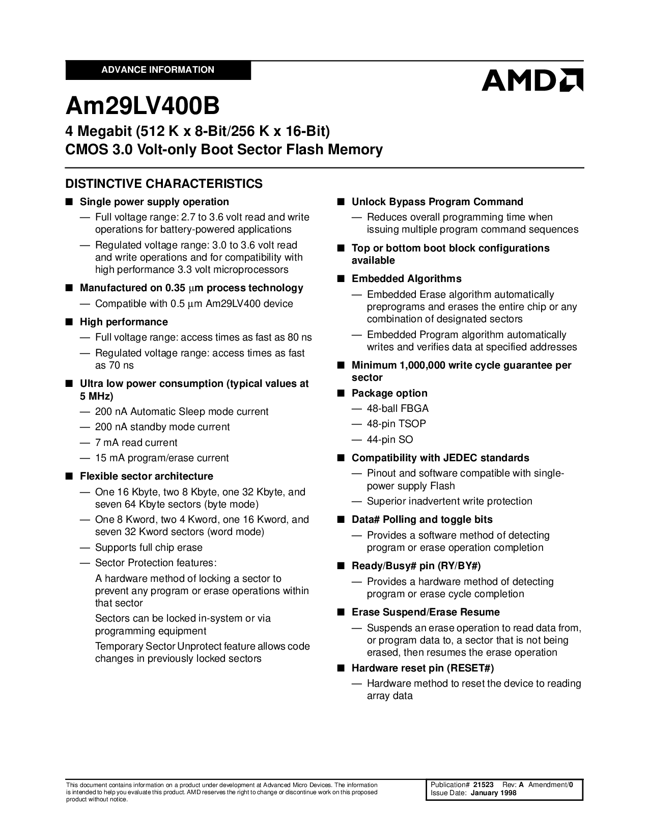 4 Megabit (512 K x 8-Bit/256 K x 16-Bit) CMOS 3.0 Volt-only Boot Sector Flash Memory