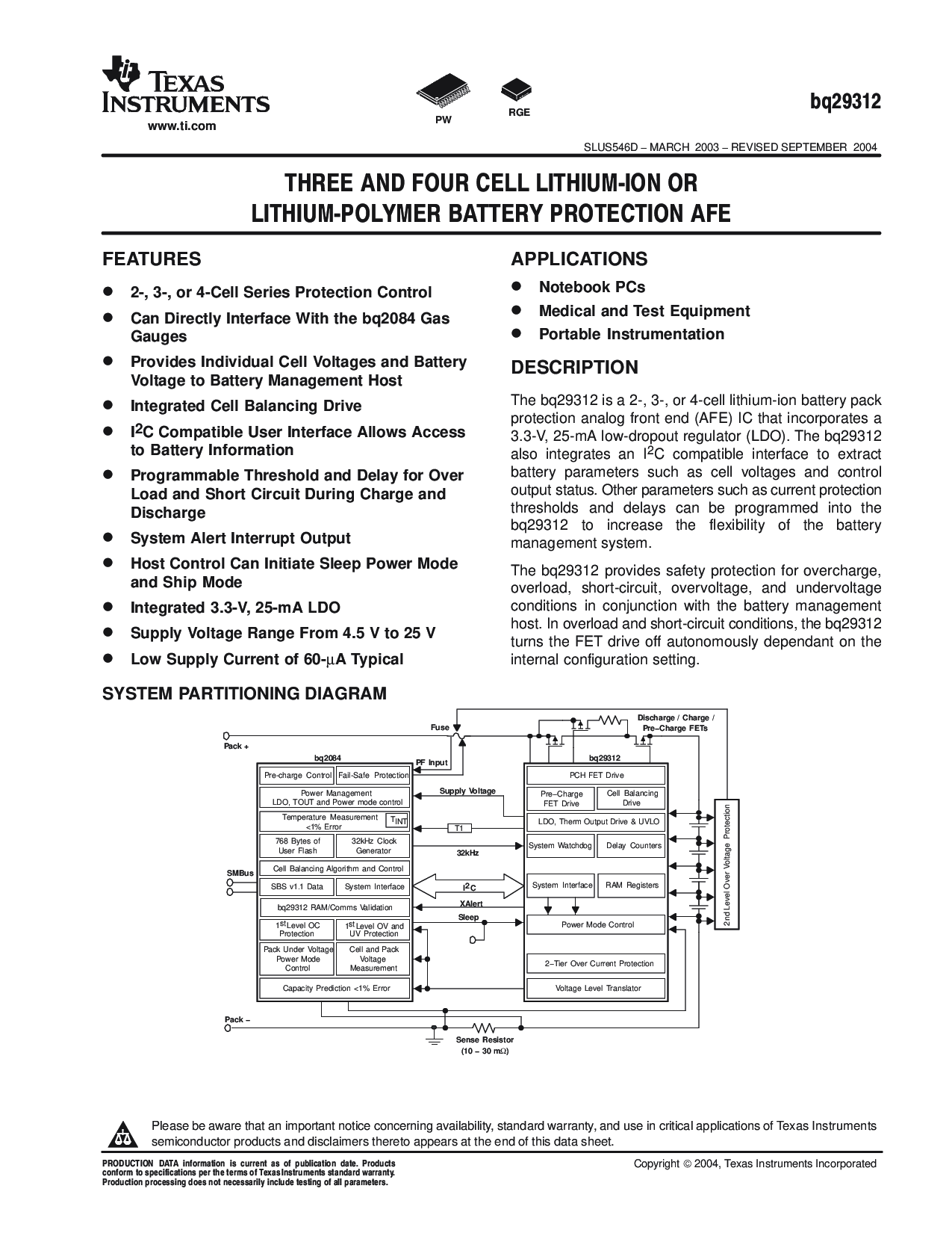 这 bq29312 是 一个 2-, 3-, 或 4-细胞 锂离子 蓄电池 空调组件