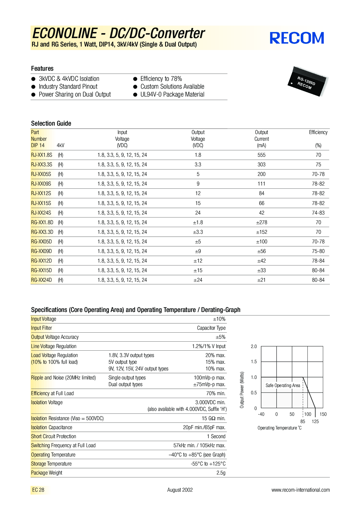 rj 和 rg 系列, 1 瓦特, dip14, 3kv/4kv (单独 &放大器; 双 输出)