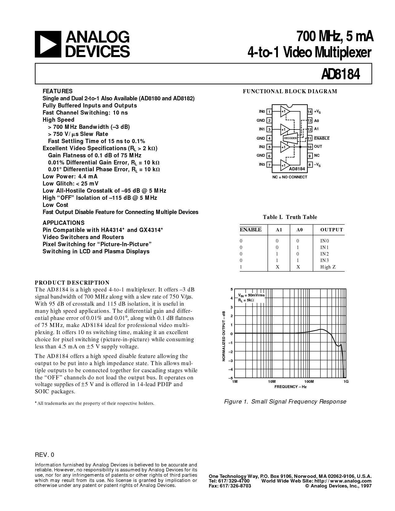 这 ad8184 是 一个 高 速度 4-至-1 多路复用器. 它 优惠 –3 db