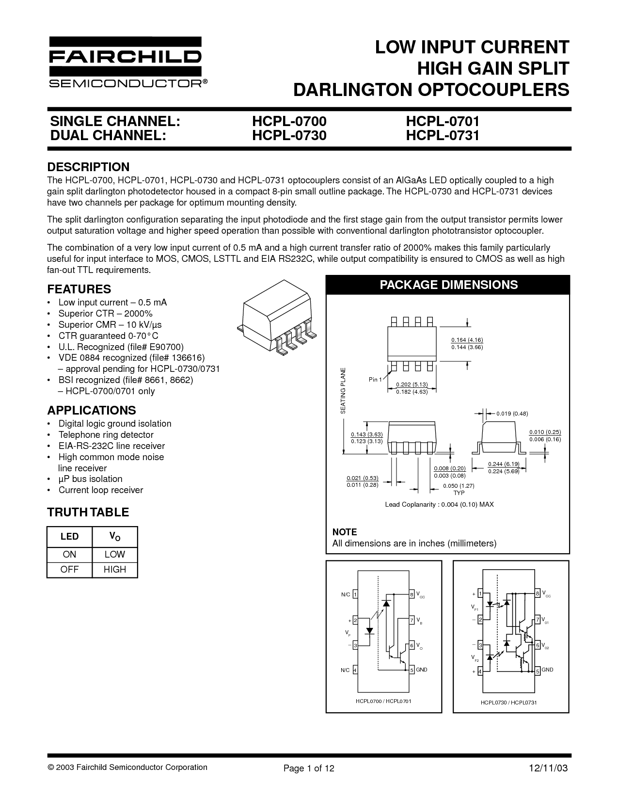 LOW INPUT CURRENT HIGH GAIN SPLIT DARLINGTON OPTOCOUPLERS