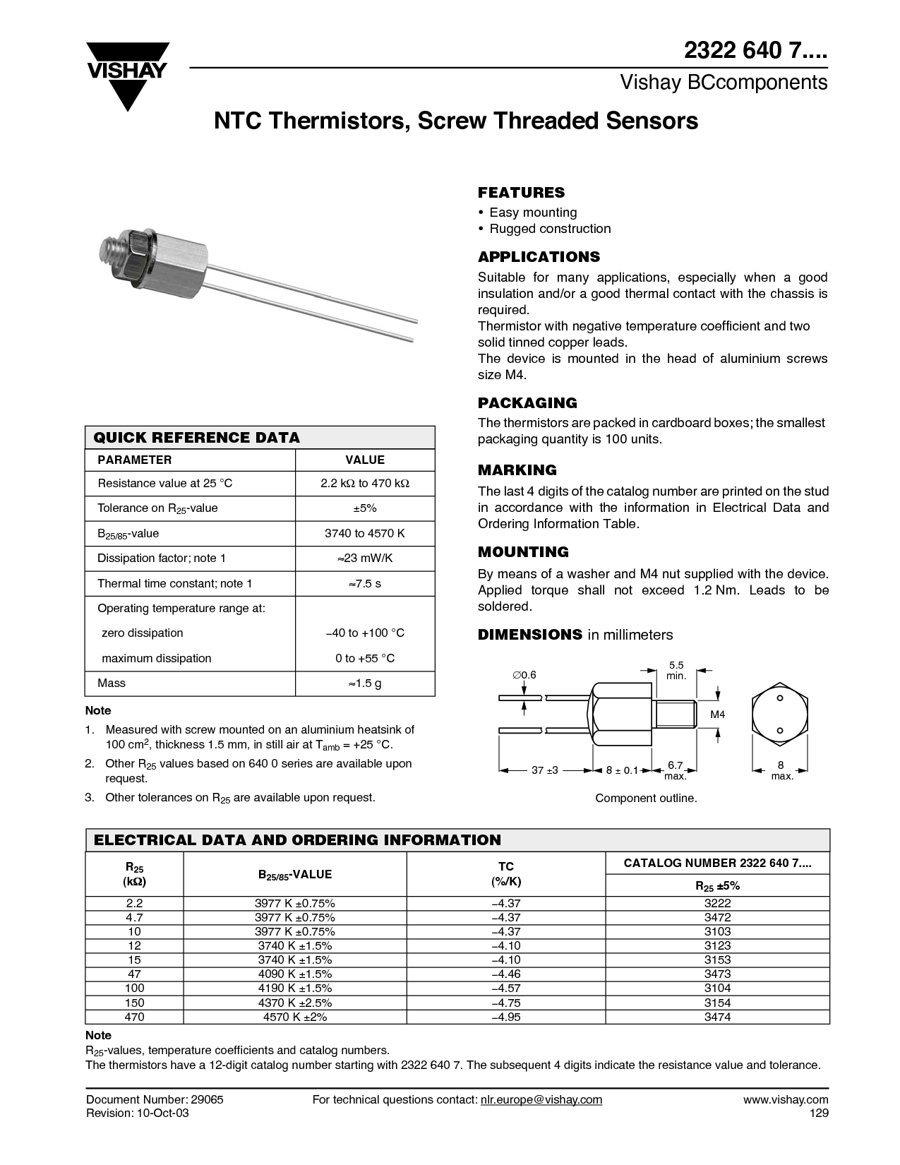 这 热敏电阻 有 一个 12-数字 目录 号码 起动 与 2322 640 7. 这 后续 4 数字 指示 这 电阻 值 和 公差.