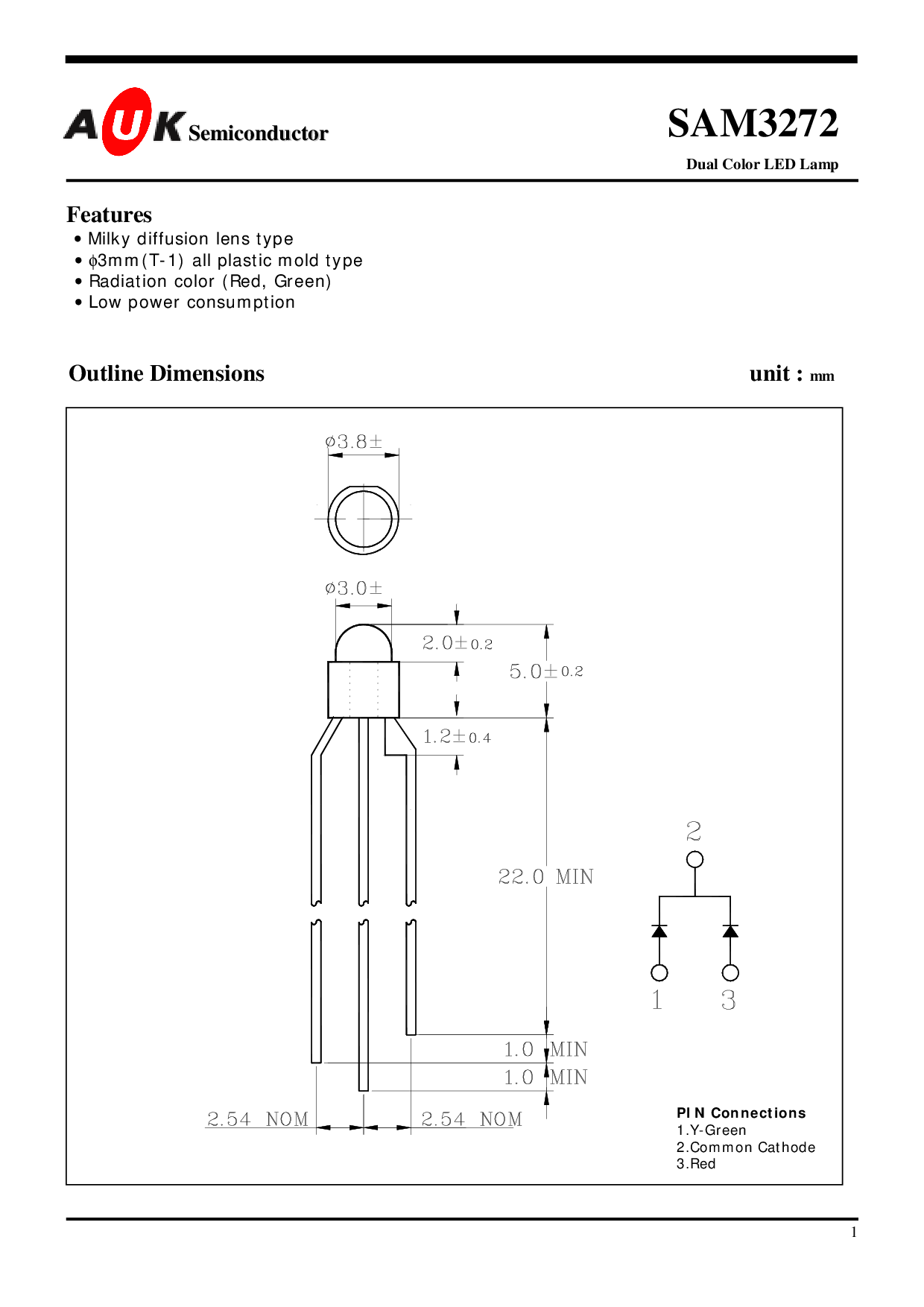 1 SAM3272 双 颜色 led指示灯 灯 特点 • milky diffusion 镜头 类型 • φ 3mm(t-1) 全部 塑料 模具 类型 • 辐射 颜色 (红色, 绿色) • 低 电源 消费 大纲 尺寸 单位 : mm s s e? e? m m 我 我 c c o o n n d d u u c c t t o o 右 右 管脚 连接 1.y-绿色 2.普通 阴极 3.红色 | |