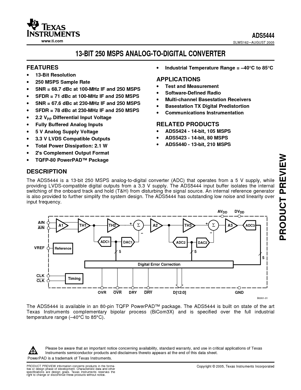 theads5444isa13-bit250mspsanalog-至-digitalconverter(adc)thatoperatesfroma5vsupply,同时